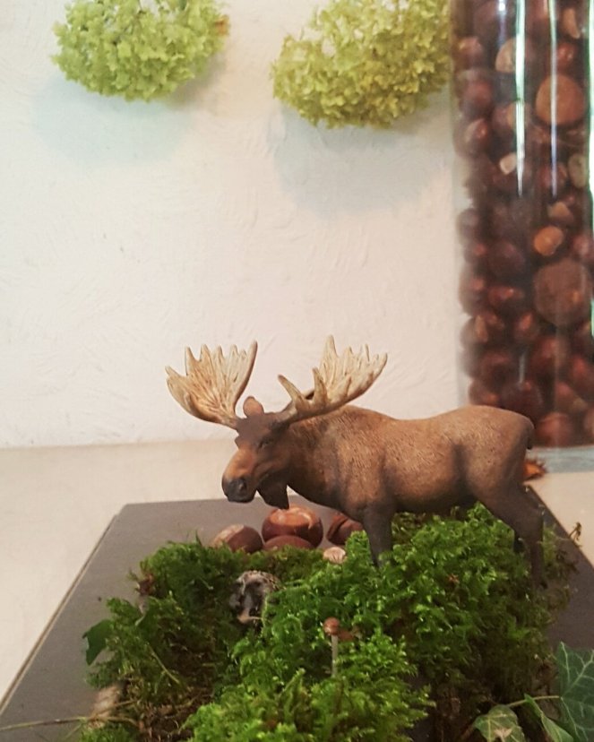 Ein paar Waldtierchen aus dem Kinderzimmer ausgeliehen, Moos dazu und der Wald ist auf den Tisch gezaubert. Da ich hier eine Holzschale benutzt habe ist diese mit Alufolie ausgekleidet, denn das Moos will gut feucht gehalten werden.