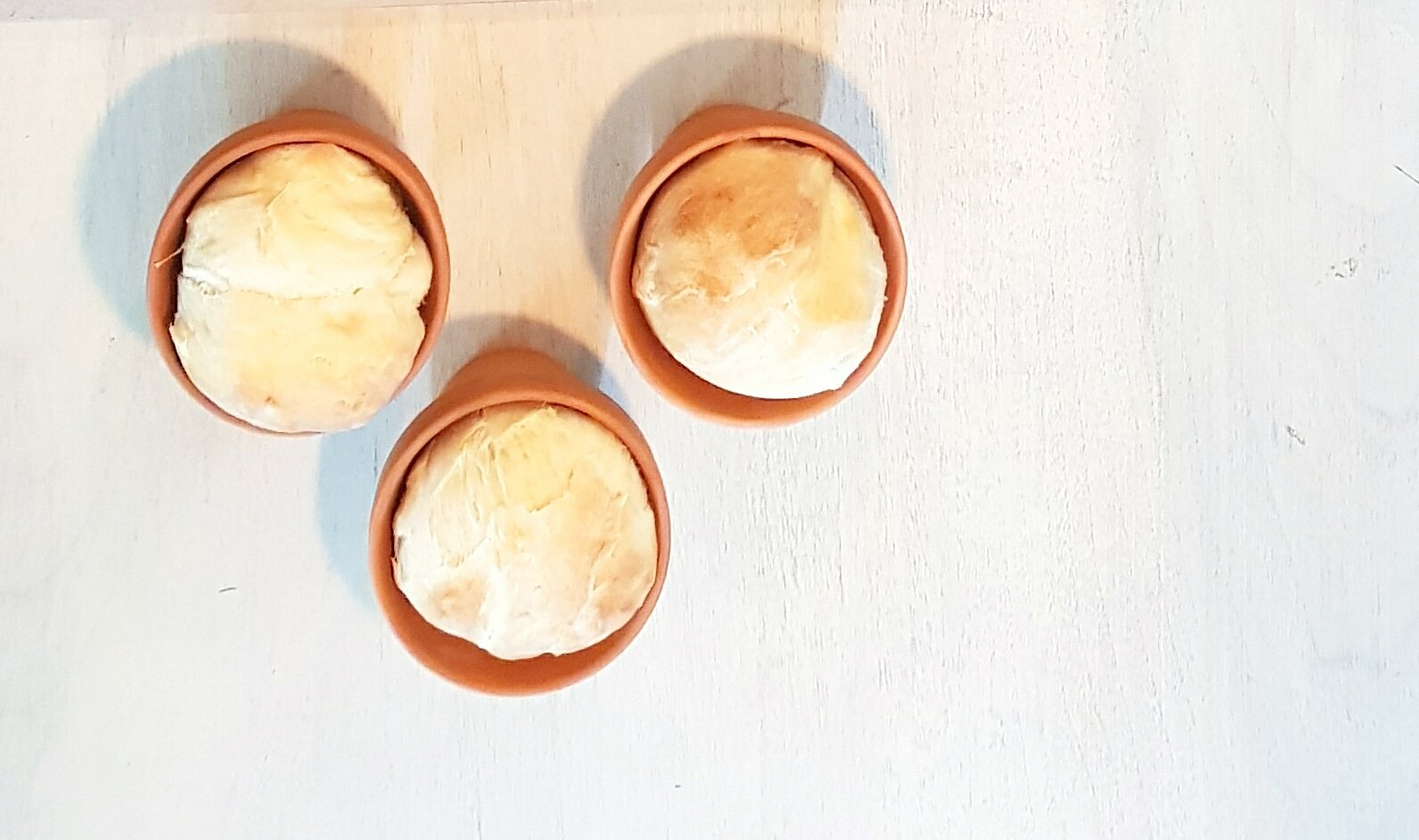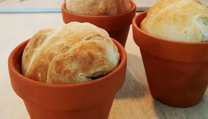 Dieses Brot im Topf ist eine sehr hübsche Alternative zum Baguette. Einfach einen Brotteig zusammenkneten und in den eingefetteten Töpfchen backen. Die Anzuchttöpfe bekommst du in verschiedenen Größen im Gartenhandel oder Baumarkt für ein paar Cent das Stück. Die Töpfchen machen sich auf dem Partybuffet eben so gut wie auf einer schön gedeckten Tafel.