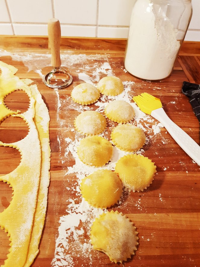 Sind sie nicht hübsch, meine kleinen Pasta-Ufos!? Diese Ravioli sehen nicht nur gut aus, sie schmecken auch noch himmlisch. Die bemehlte Arbeitsfläche und das Ausrollen des Teigs und auch die Zutaten passen mit ein bisschen weihnachtlicher Musik und einem Glas Wein schon beim Zubereiten perfekt in die Zeit der Weihnachtsbäckerei.