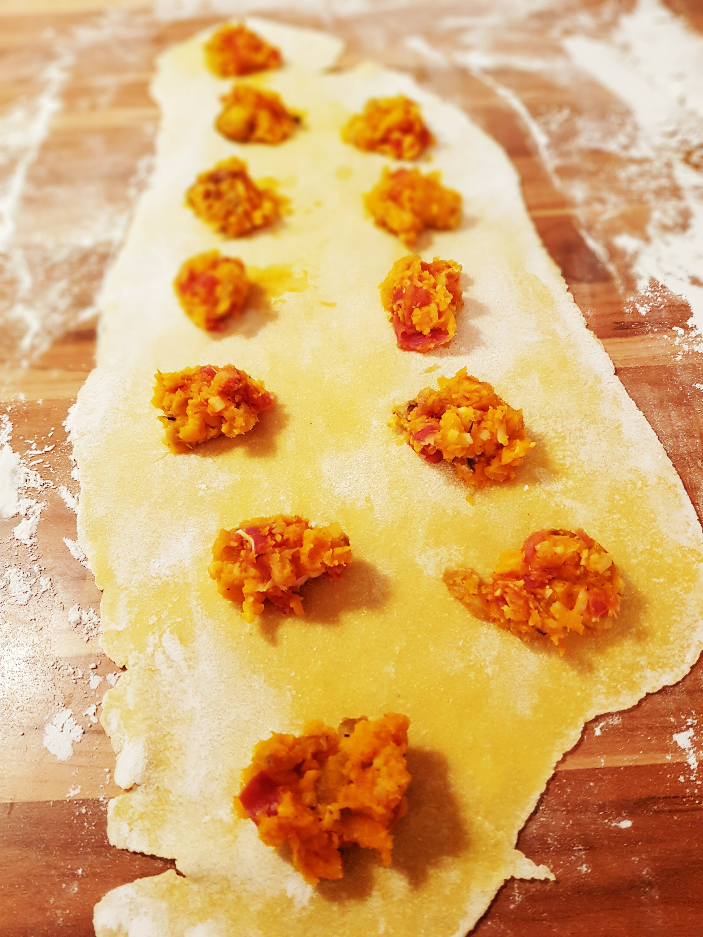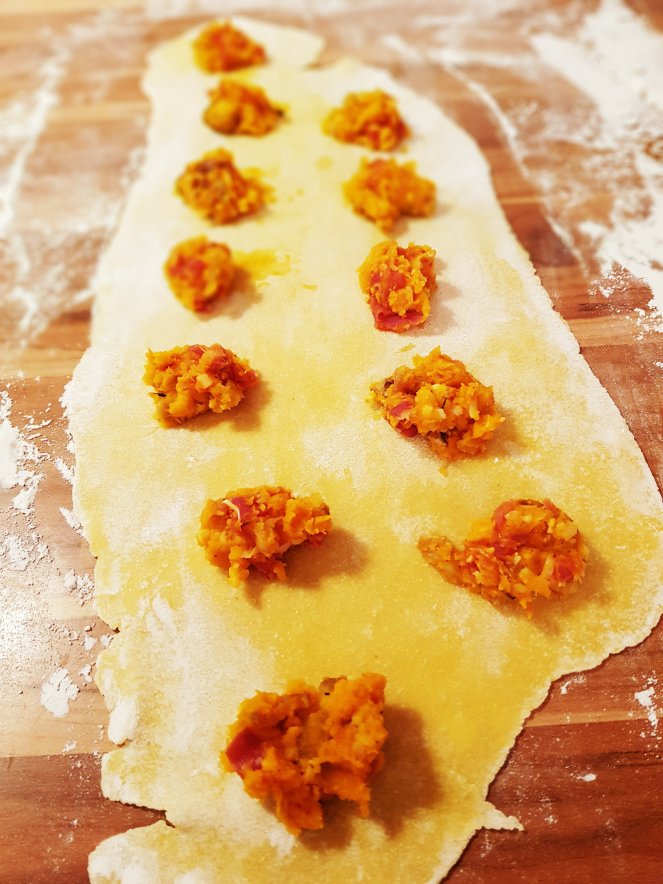 Ravioli mit einer Füllung aus Kürbis, Prosciutto und Maronen