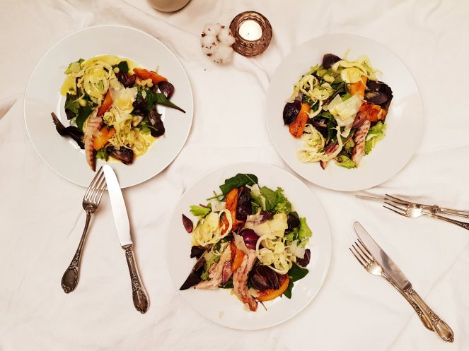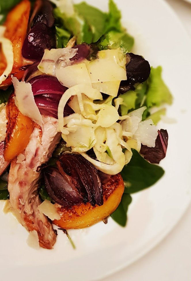 Salat mit gerösteten Pfirsichen, Räuchermakrele und Zitrusdressing