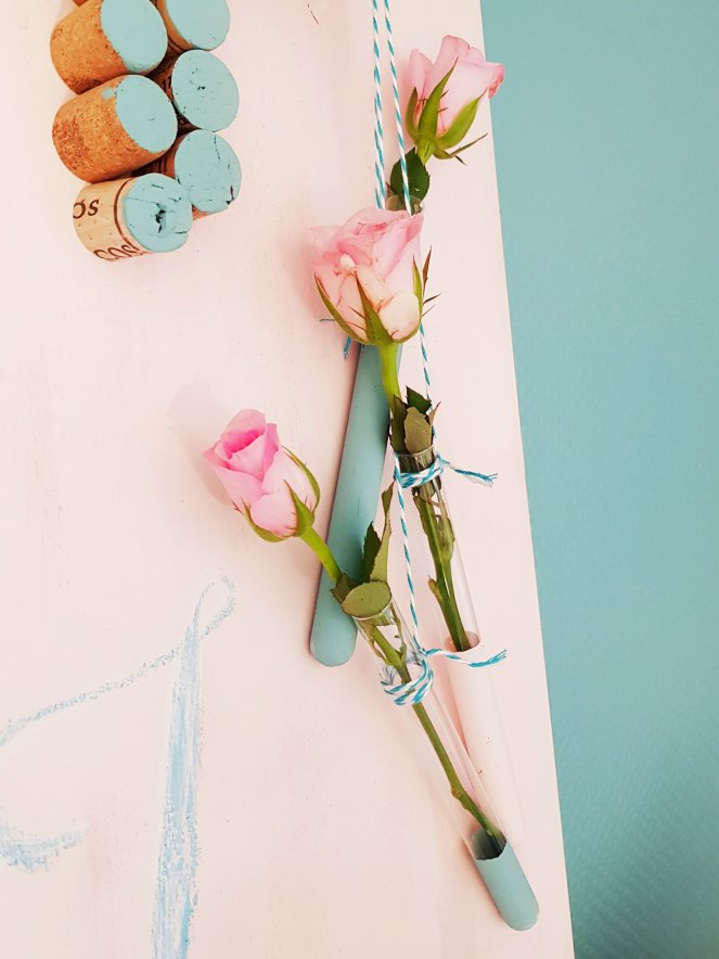 Für die kleinen Blumenvasen haben wir Glaskolben benutzt, in denen einst Vanilleschoten aus dem Supermarkt ruhten. Auch sie bekamen einen Teilanstrich mit den Farben, die wir für das Board genutzt hatten. Auch hier das Abkleben vor dem Anstrich nicht vergessen!