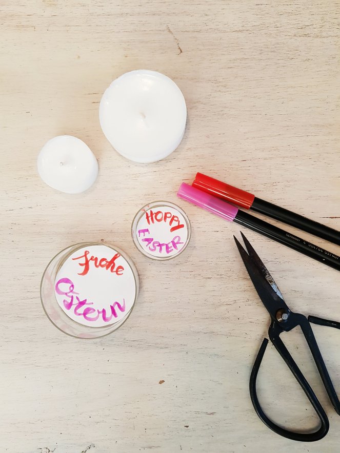 Ich versteckte also kleine hand-geletterte Botschaften unter dem Wachs (die Einzelheiten kann ich dir sparen) zündete die Teelichte an und wartete vergeblich – die kleine Flamme schafft es nicht, der Wachs wird nicht durchsichtig. Erst ganz zum Ende hin kann man den Text ansatzweise lesen. Schade.