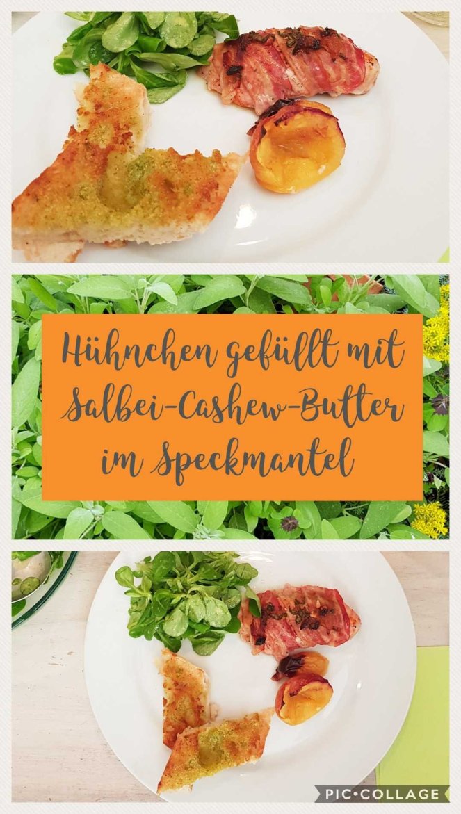 5 Hühnerbrüste mit Salz, Pfeffer und geräuchertem Paprikapulver würzen und längs einschneiden. Die Einschnitte mit der Cashew-Salbei-Butter füllen und die Hühnerbrüste mit je 2 (von 10 Scheiben Speck) umwickeln. Die Reste der Würzbutter auf das Fleisch streichen.