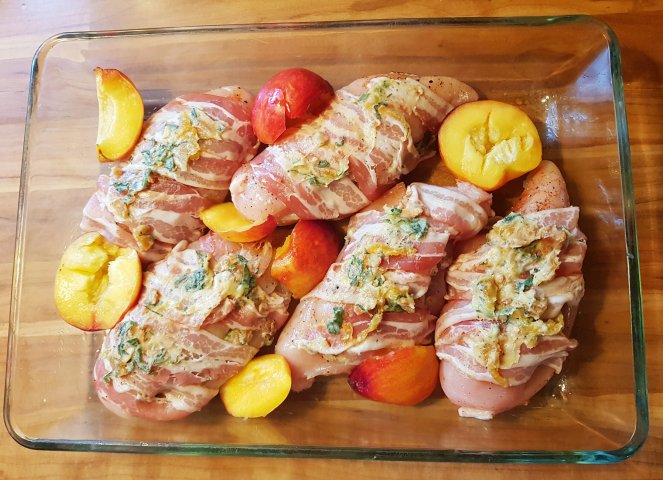 Das Fleisch in eine Auflaufform legen. 5 Nektarinen vom Kern befreien und zwischen den Hühnchen verteilen.