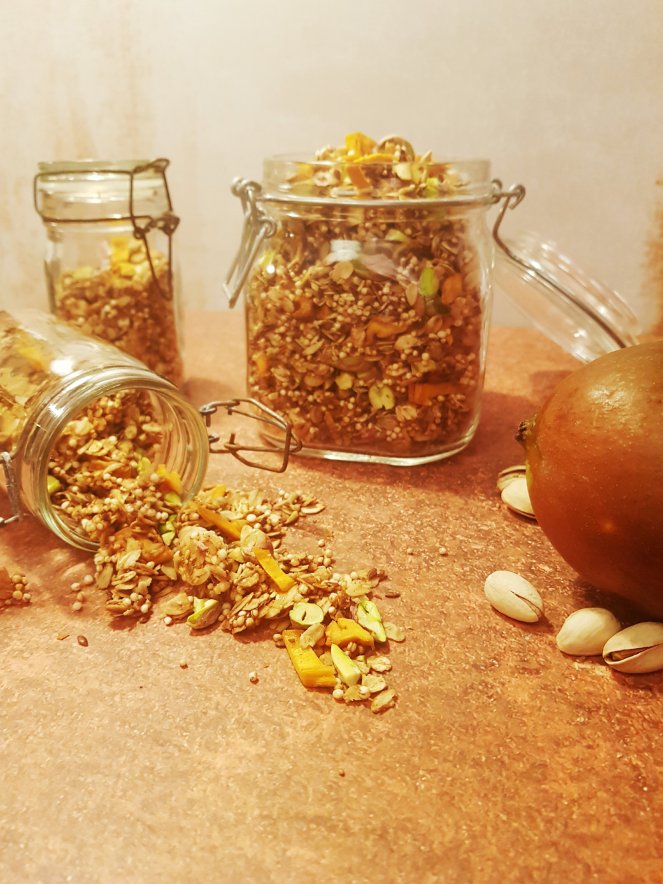 mit getrockneter Mango und Pistazien