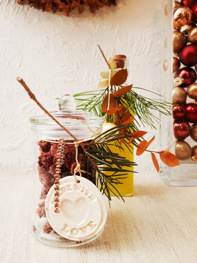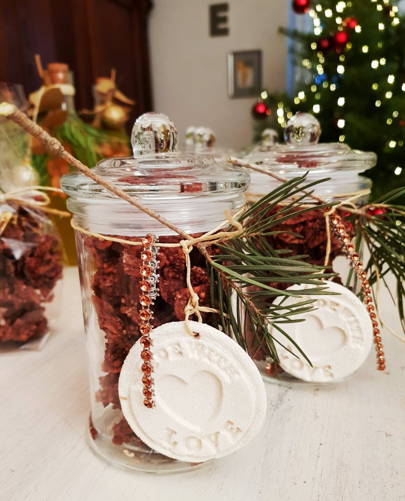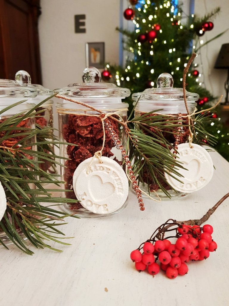 Die köstliche Aufmerksamkeit in schöne Gläser oder Tütchen füllen und weihnachtlich dekorieren.