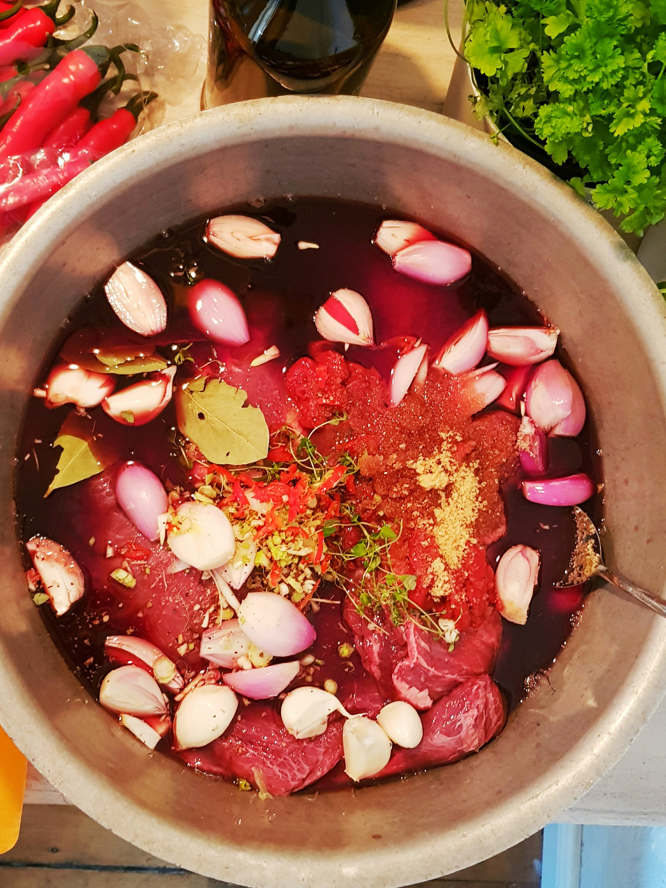 zur Marinade geben alles etwas einkochen lassen, bis der Alkohol verkocht ist. Das Fleisch und die Sauce zu dem Gemüse in den Bräter geben und im Ofen 3 bis 4 Stunden schmoren lassen, dabei das Fleisch ab und zu wenden. Es ist perfekt, wenn es so zart und butterweich ist, dass es sich mit dem Löffel zerteilen lässt.