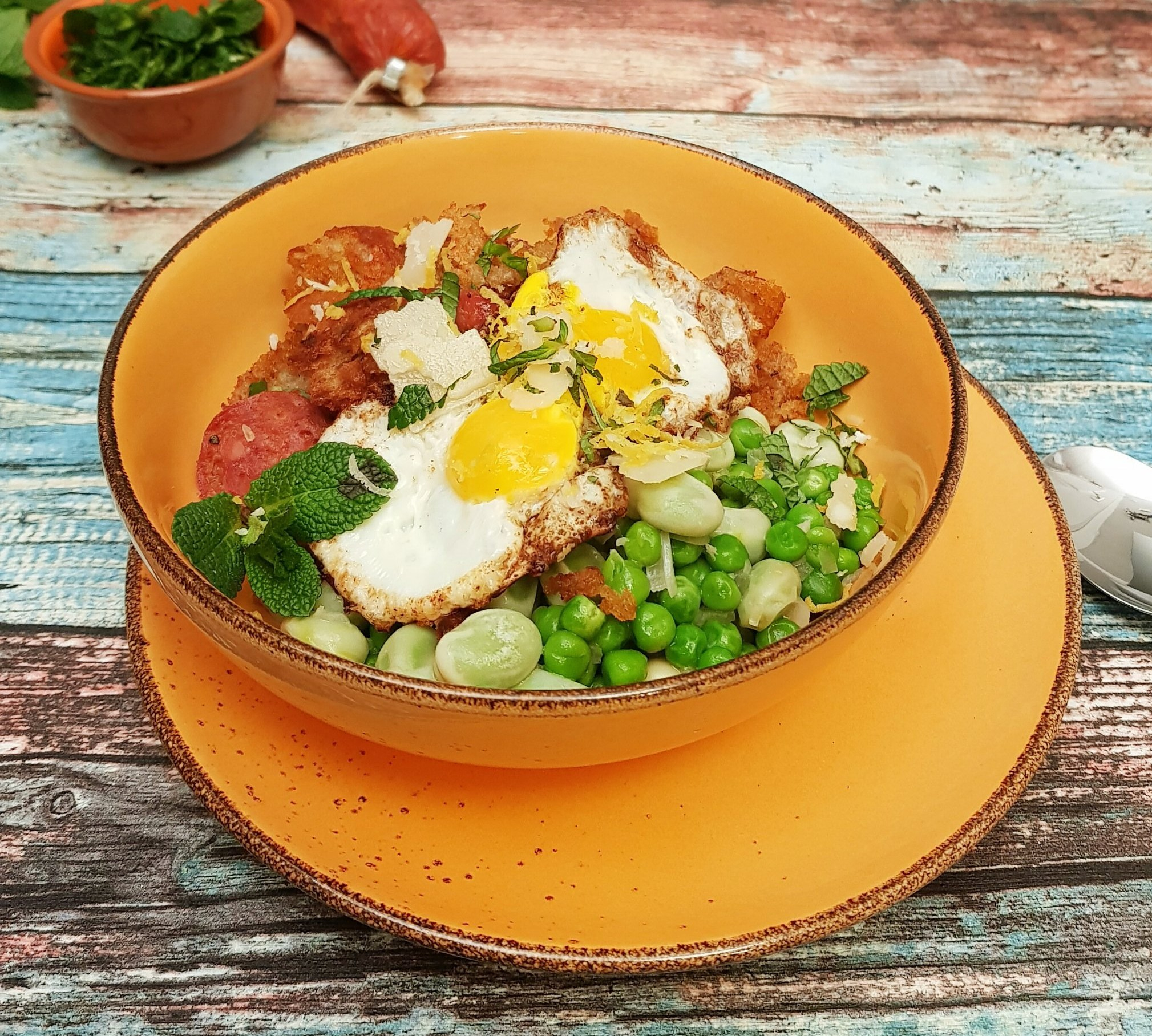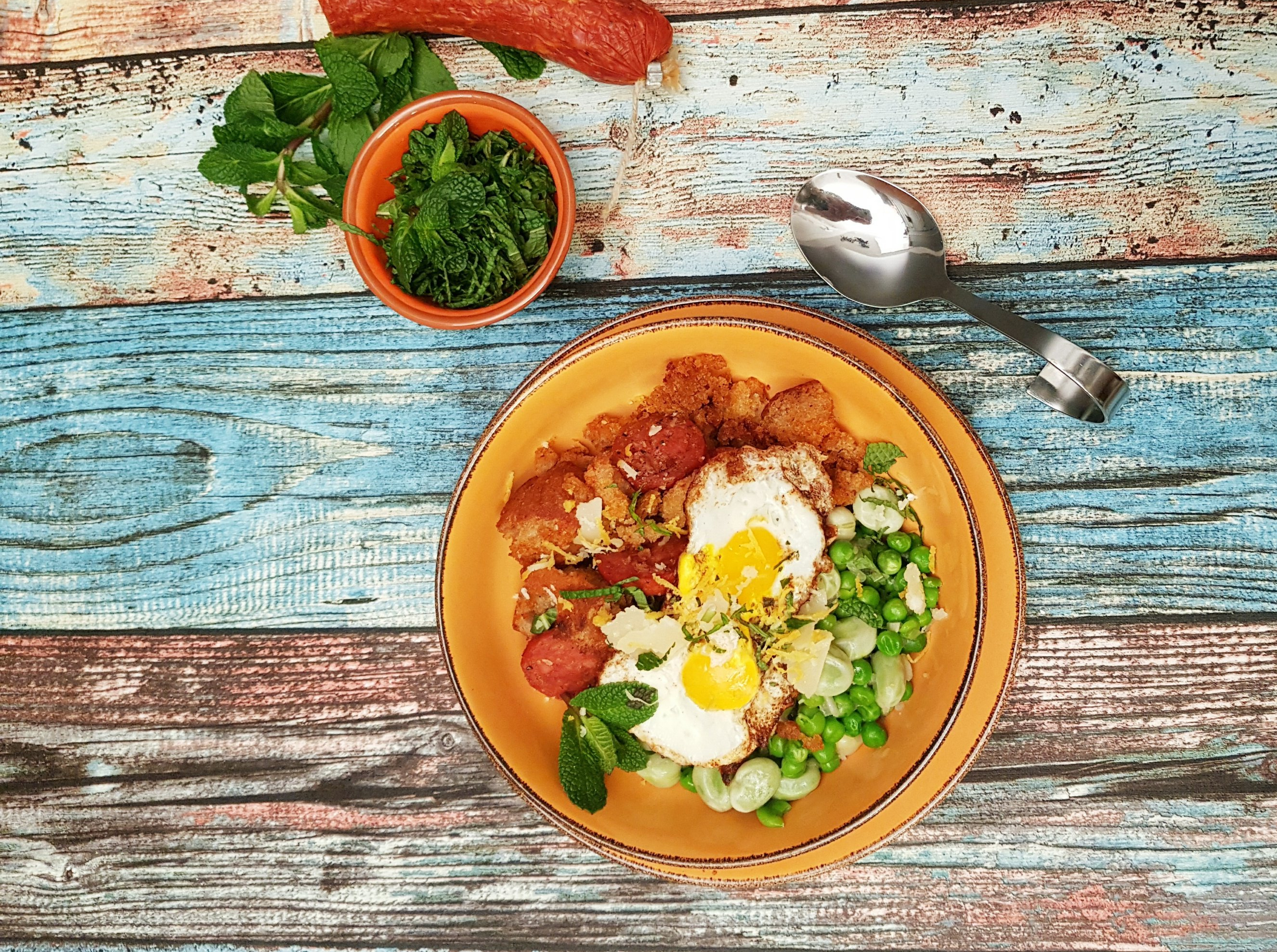Die Chorizo-Migas mit dem Gemüse und etwas Brühe in Teller geben, mit den Eiern toppen und mit Parmesan, Minze und Zitronenabrieb garnieren.