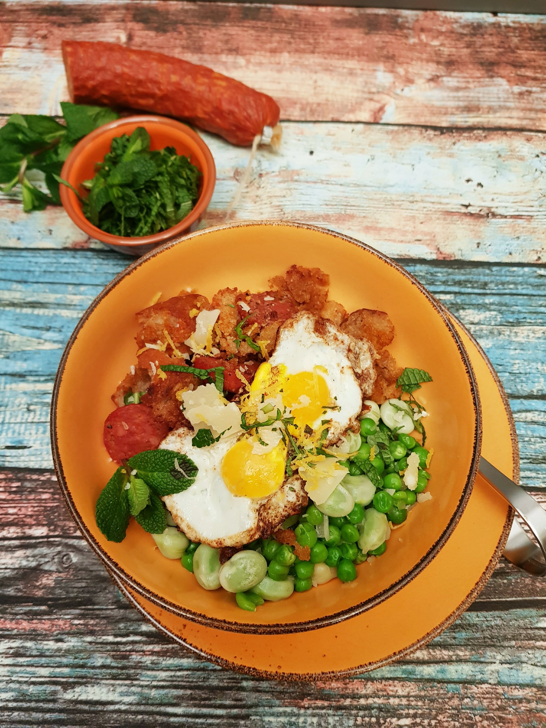 Bei uns gibt es dieses Gericht richtig oft. Wir haben es nach unserem Geschmack erweitert und verfeinert. Es ist schnell, einfach und preiswert. Wenn älteres Brot da ist, kommt es mir automatisch in den Sinn. Und Chorizo, Eier und TK-Erbsen habe ich eigentlich immer im Haus.