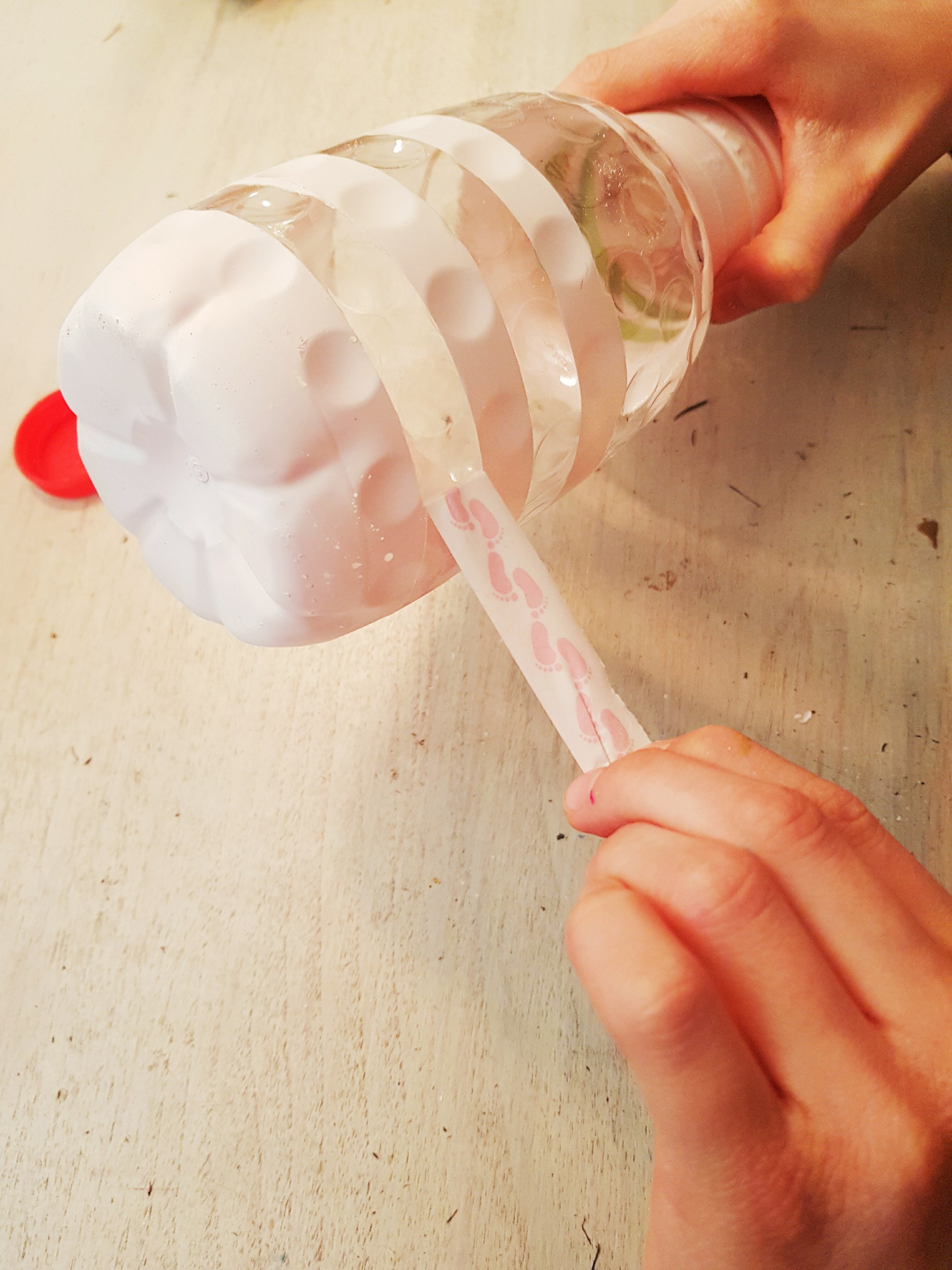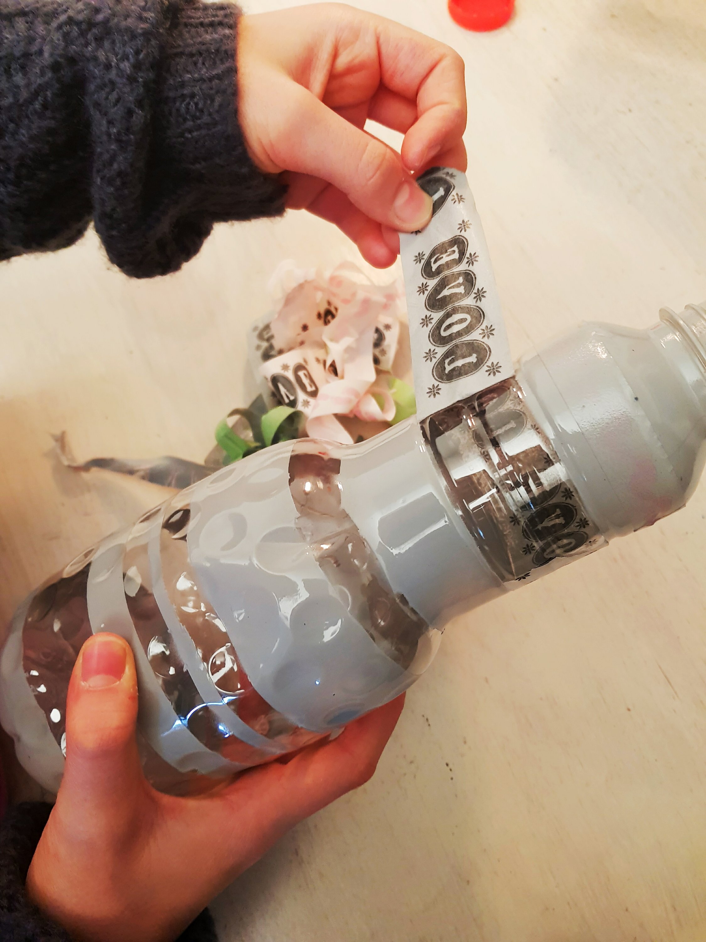 Die Saftflasche gut spülen (Tipp: Gebissreiniger nutzen). Die trockene Flasche von außen in mehreren Runden mit Washi-Tape oder einfachem Klebefilm bekleben.