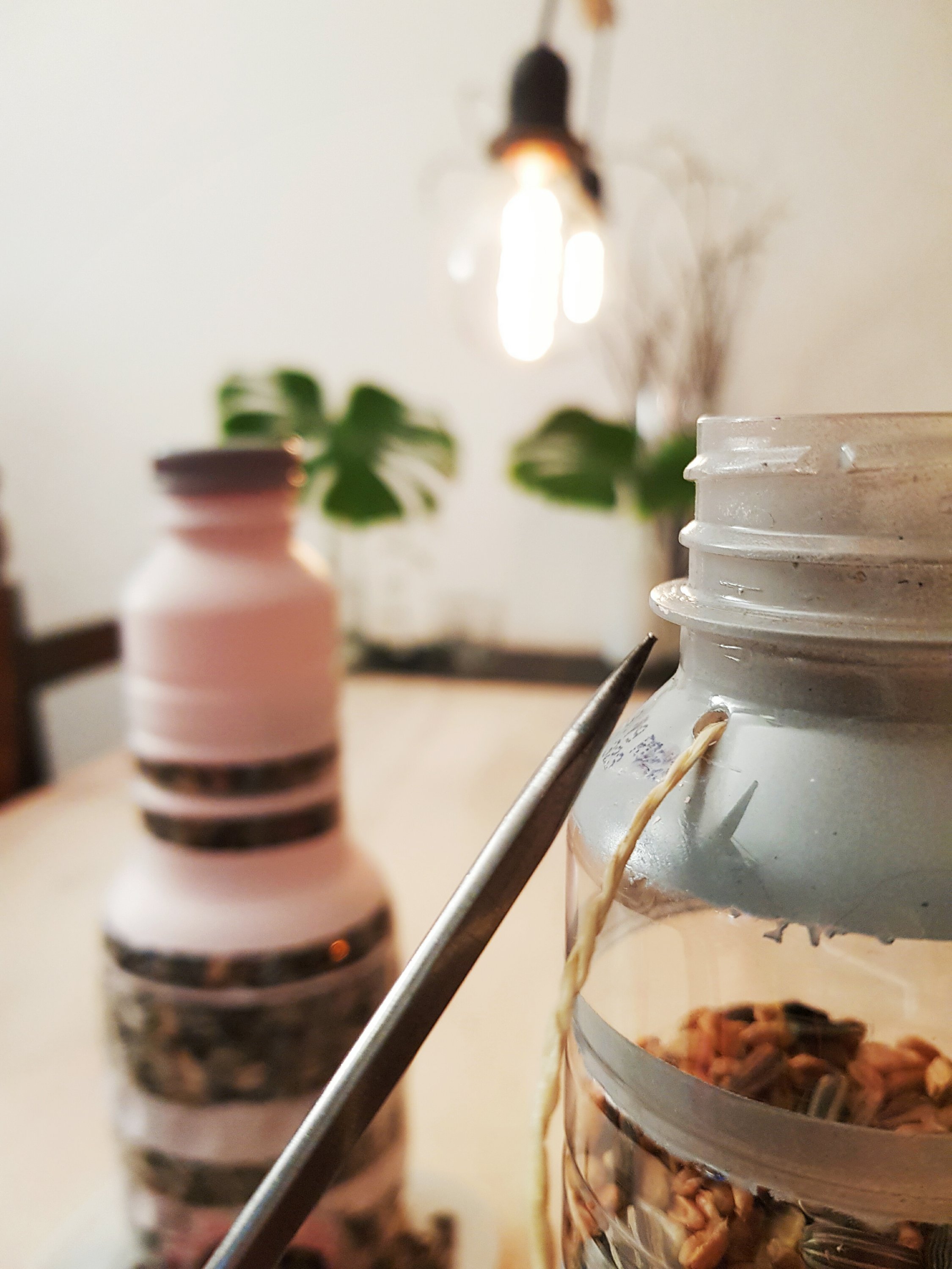 Unterhalb des Flaschenhalses zwei gegenüberliegende Löcher für die Aufhängung bohren (z.B. mit einem Schaschlikspieß)…