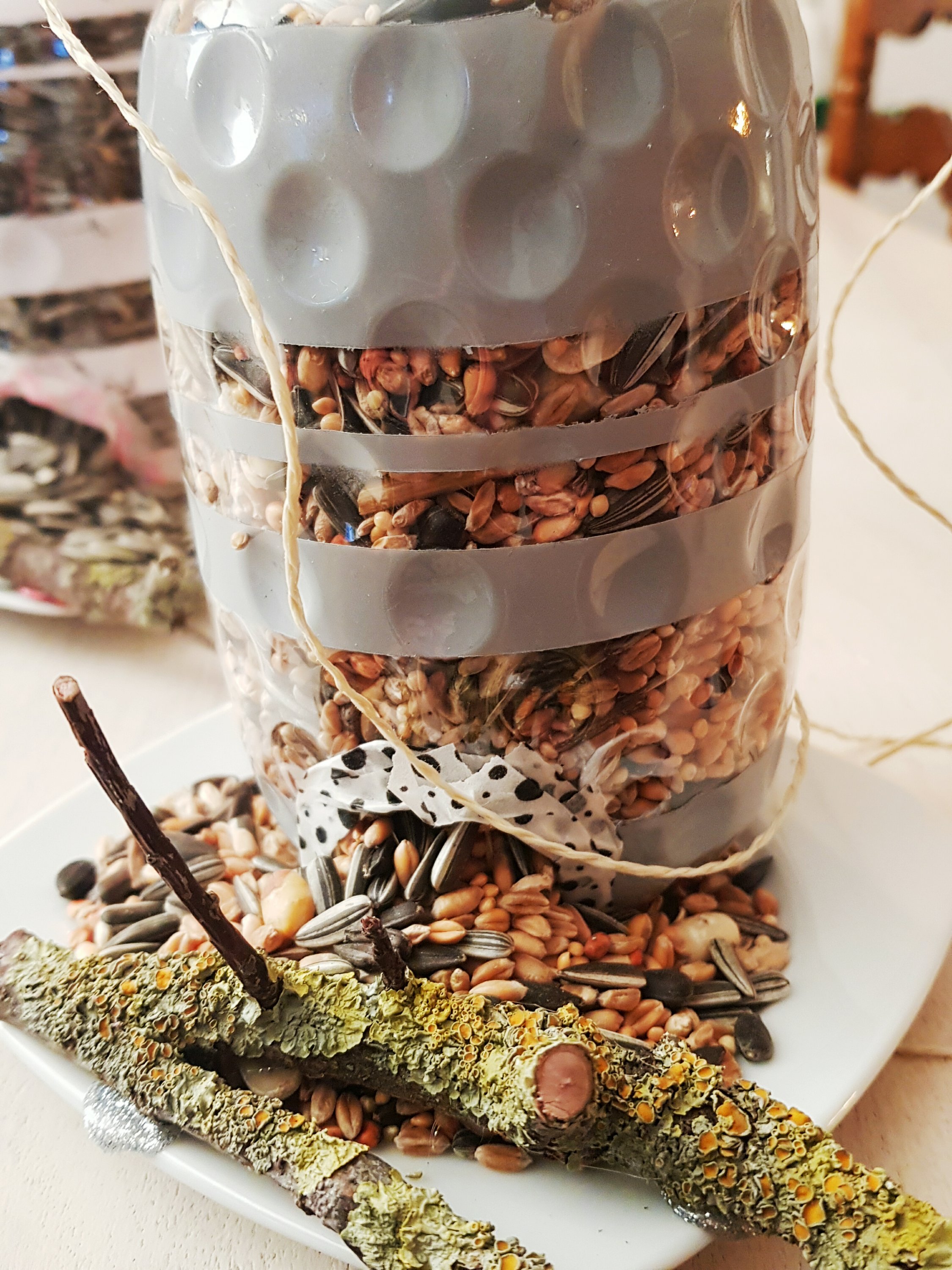Material: eine leere Kunststoff-Flasche, Washi-Tape, Sprühfarbe, Heißkleber, Dessertteller aus möglichst leichtem nicht zu glattem Material, Paketschnur, Vogelfutter