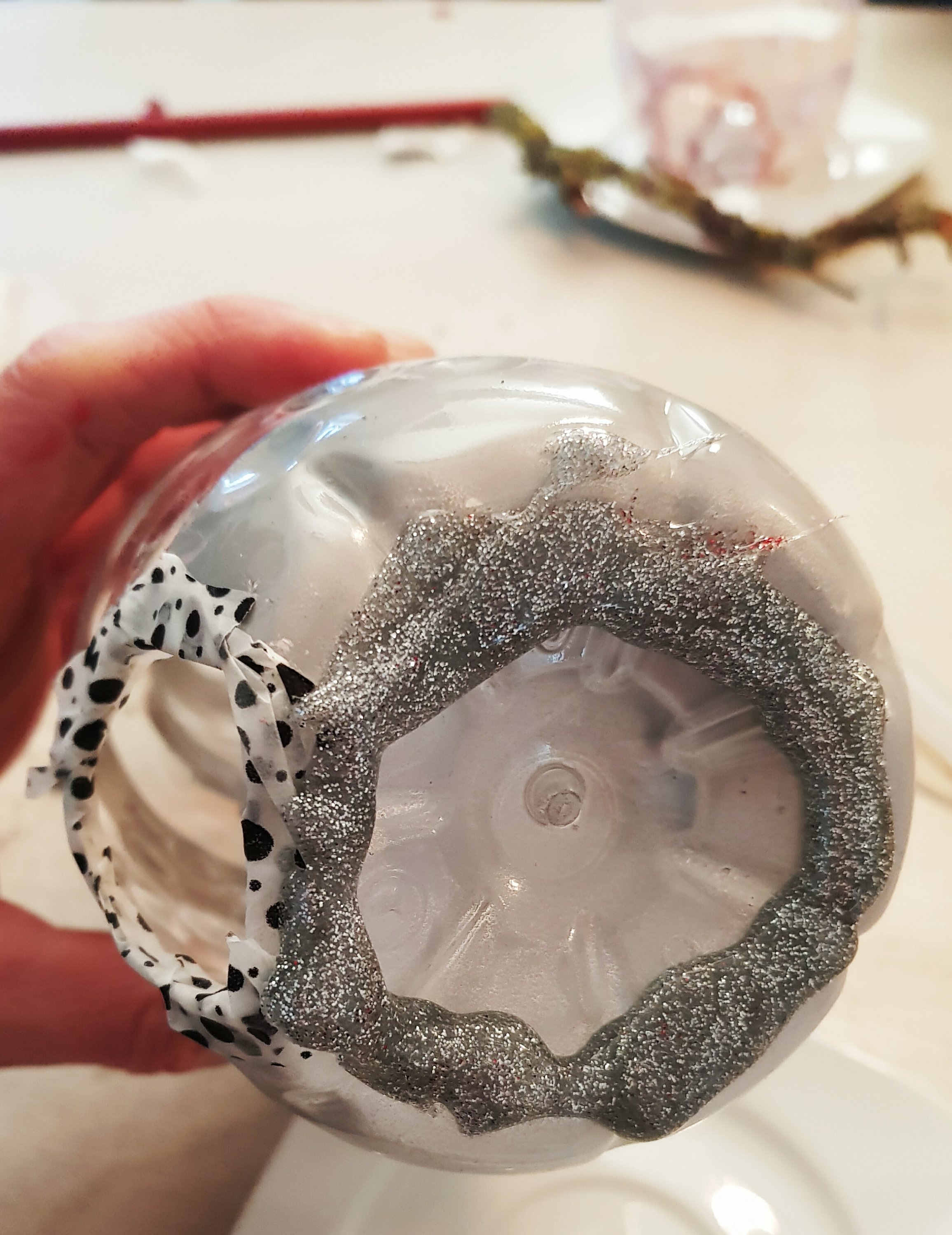 Nun die Flasche mit Heißkleber (in Paulinas Fall immer gerne in Farbe und mit Glitzer) auf einen kleinen Teller kleben.