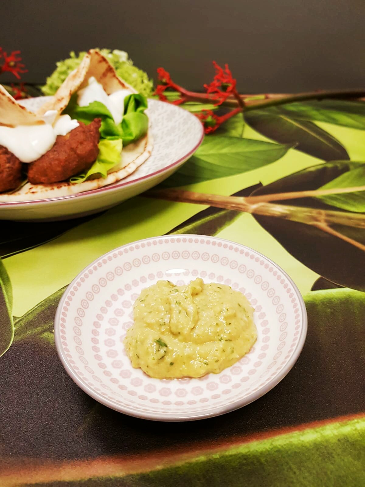 Alle Zutaten in der Küchenmaschine zu einem Humus pürieren. Nach und nach