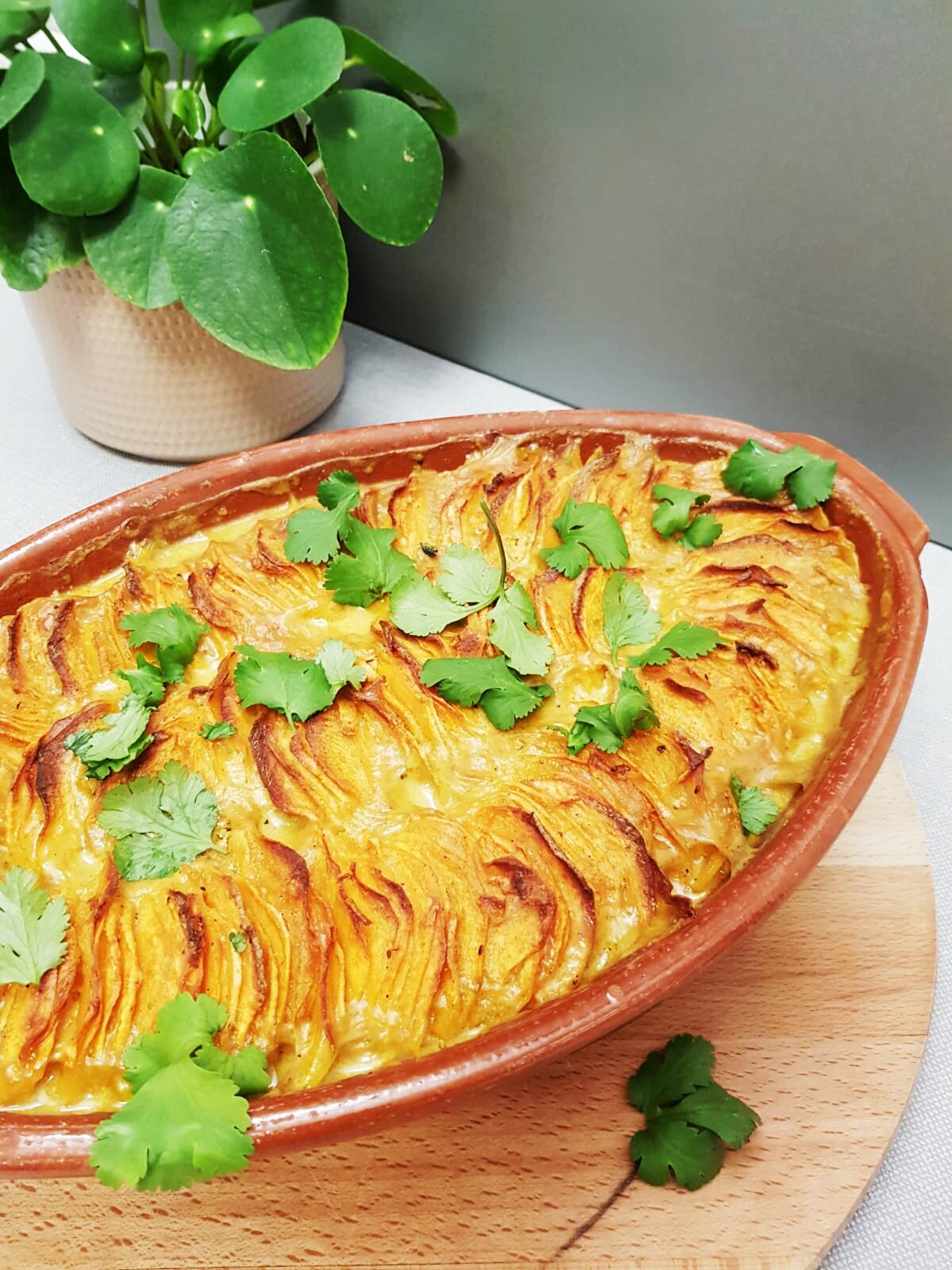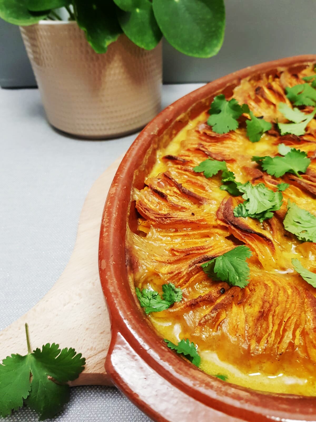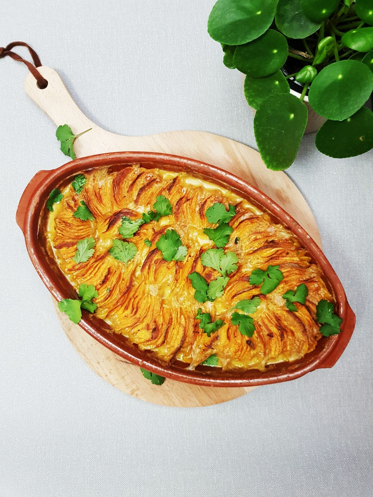 Die Kokosmilch in einer Schüssel mit den Gewürzen verrühren und die Kartoffelscheiben unter die Würzmilch rühren, so dass alle Scheiben mit Flüssigkeit benetzt sind (das geht am Besten mit den Händen).