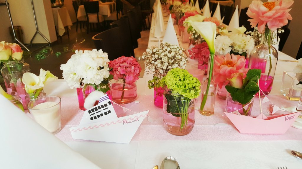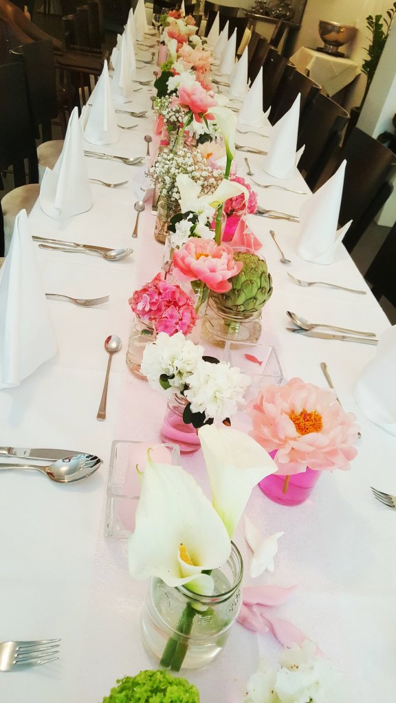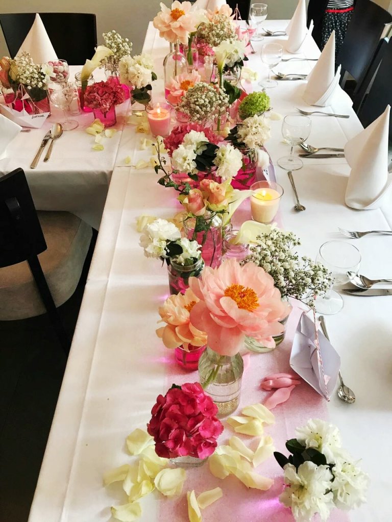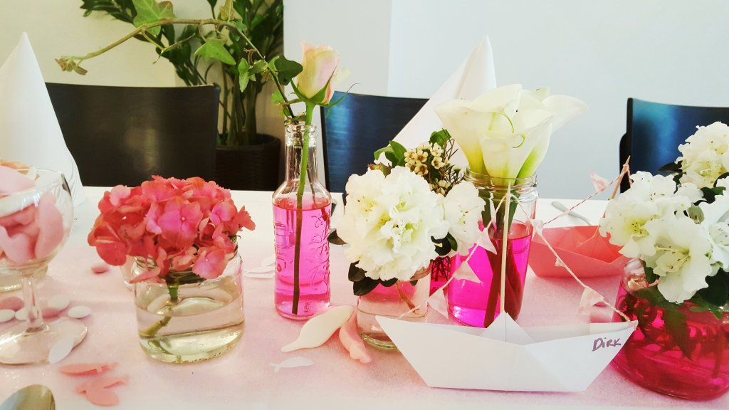 Die Gäste haben sich übrigens gleich zweifach über die Blumendeko gefreut. Zunächst einfach, weil sie so schön anzusehen war und sie dort Platz nehmen durften. Und zum Ende der Feier nochmal, denn sie durften so viele Väschen mitnehmen, wie sie wollten (zu Hause habe ich nämlich gar nicht genug Platz für dieses Meer von Blumen – wer hätte das gedacht). Und der Wirt durfte auch noch ein paar behalten und hat damit sein Restaurant für die nächsten Tage noch geschmückt.