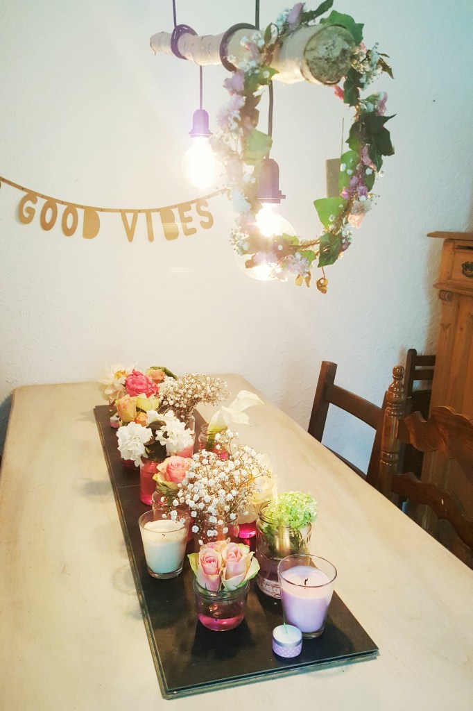 Wie viele Gläser und Blüten ihr benötigt, hängt natürlich davon ab, wie lang die Tafel ist. Für einen Meter der Tischmitte empfehle ich etwa 15 Vasen und 3 Kerzen.