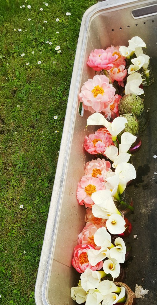 - Blumen in 2 bis 3 Farben – z.B. weiß-rosa-pink (hier: Rosen, Hortensien, Schleierkraut, Pfingstrosen, Calla, Efeu aus dem Garten, Artischocken, Schneeball), zusätzlich ein paar Rosen zum Zerrupfen und Streuen