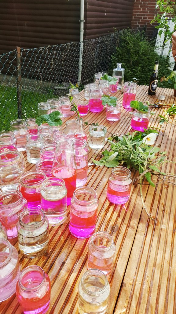 Zunächst füllt ihr einen großen Behälter mit Wasser und legt ein Stück Kreppapier ins Wasser (hier: pink). Achtet beim Kauf darauf, dass ihr kein gutes Krepppapier mit der Aufschrift (nicht abfärbend) aussucht: in diesem Fall ist der Abfärbe-Effekt gewünscht, denn euer Blumenwasser wird sich durch das Krepp färben. Je mehr Papier ihr ins Wasser legt, desto kräftiger wird die Farbe. Ihr könnt auch Lebensmittelfarbe verwenden, aber diese Variante ist einfach und preiswerter. Man kann das Wasser natürlich auch klar lassen. Uns gefällt der Effekt des bunten Blumenwassers. Ich habe hier einige Vasen mit rosafarbenen und andere mit pinkem Wasser gefüllt und auch ein paar klar gelassen.