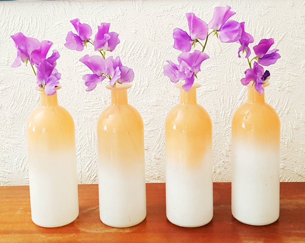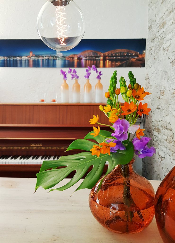 Bei meinem letzten Besuch wollte ich ja nur jede Menge Blumen für die Tischdeko zur Kommunion kaufen… Ihr ahnt es: ich traf auf die orangefarbenen Vasen und verliebte mich auf der Stelle. Konnte nicht dran vorbei. Mussten mit.