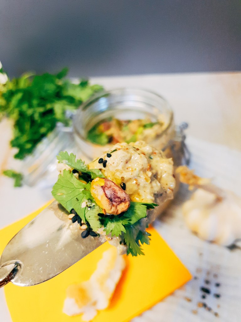 Da kredenze ich euch doch lieber meine Variation des Baba ganoush. Mein Schwesterherz bringt diese köstliche Auberginencreme aus der arabischen Küche so regelmäßig mit zum Grillen, dass ich sie eigentlich gar nicht machen müsste. Dann hatte ich aber doch Lust, sie mal selbst auszuprobieren. Ich wusste nur, dass Anja gebackene Aubergine und Tahin mischt und Unmengen Koriander dazugibt (kann man natürlich durch Petersilie ersetzen, kein Ding), nicht jedoch, was ihre weiteren Zutaten sind oder welche traditionell hineingehören. Ist mir auch nicht wichtig, denn darin liegt doch der ganze Spaß! Kochen ist Kreativität!