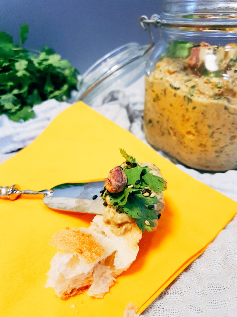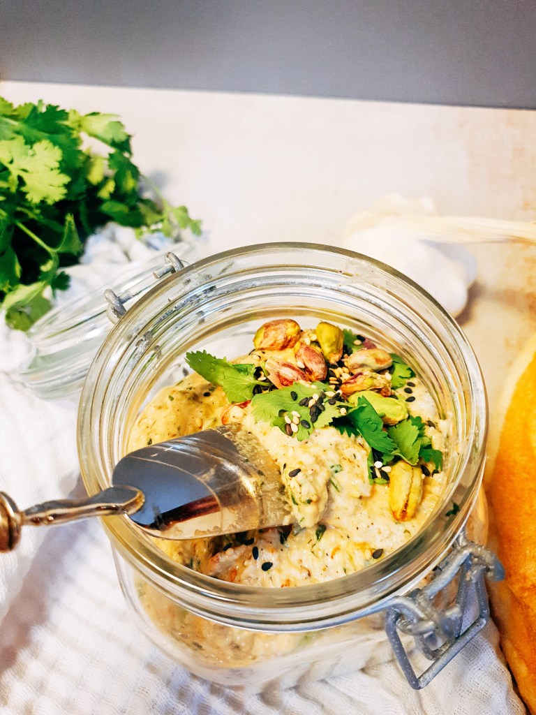Das abgekühlte Baba ganoush mit gehackten gerösteten Pistazien und dem Joghurt verfeinern und garnieren. Ein paar geröstete Sesamkörner greifen das Tahin wieder auf und sehen auch noch ganz hübsch aus obendrauf. OOOOOPS – jetzt gab´s doch noch ein Tüpfelchen Deko! 😀