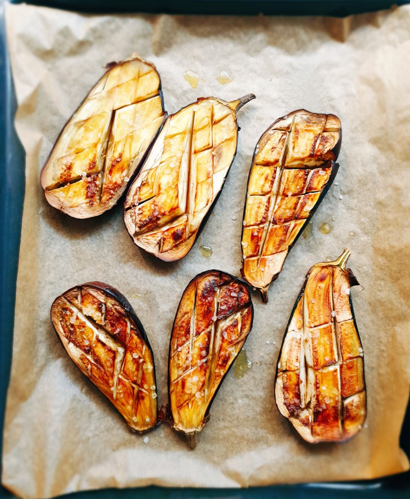 Den Backofen auf 200 Grad Umluft vorheizen. Die Auberginen der Länge nach aufschneiden. Mit der Innenseite nach oben auf ein Backblech legen, kreuzweise einritzen und mit reichlich Olivenöl beträufeln sowie mit grobem Meersalz würzen und für 30 Minuten im Backofen rösten. Auskühlen lassen und mit einem Löffel das Fruchtfleisch aus den Schalen lösen.
