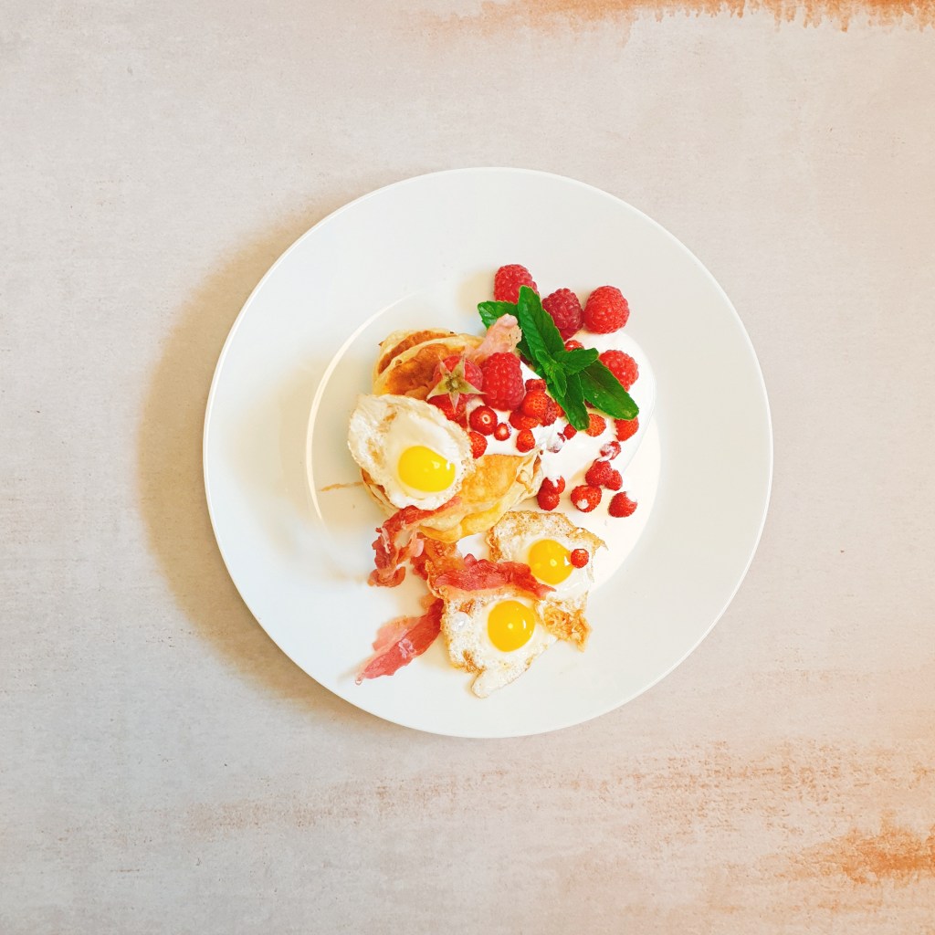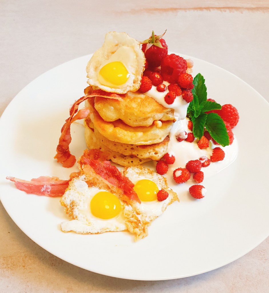 Die Pancakes auf Esstellern anrichten, mit dem Joghurt beträufeln und mit den Beeren garnieren. Speck und Ei dazu drapieren und mit ein paar Minzeblättchen garnieren.