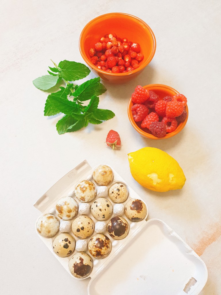 Der Garten gibt noch so einiges an frischsten Bio-Zutaten her. Ich zupfe die Erdbeerchen von den Wildpflanzen und die Himbeeren vom Strauch (wie gut, dass beides über Wochen nachwächst), klaube die Zitrone vom Bäumchen und stehle den Wachteln die Eier aus dem Stall. Und schon geht’s los!