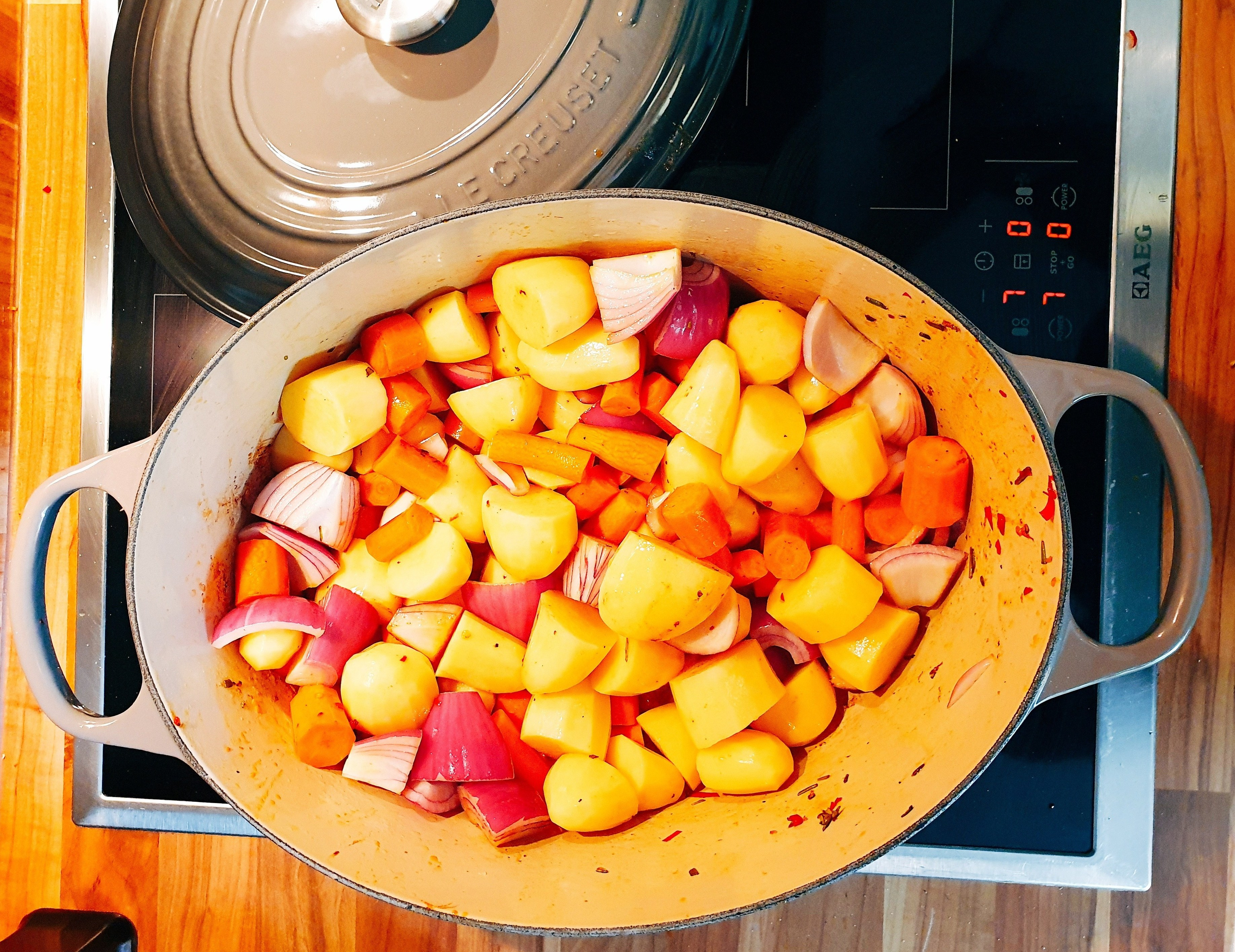 Erneut etwas Öl in den Bräter geben. Nun die Kartoffeln, Möhren, Zwiebeln und Knoblauch anbraten. Weißwein angießen und köcheln lassen, bis der Alkohol verdampft ist. Hiernach die heiße Brühe angießen.