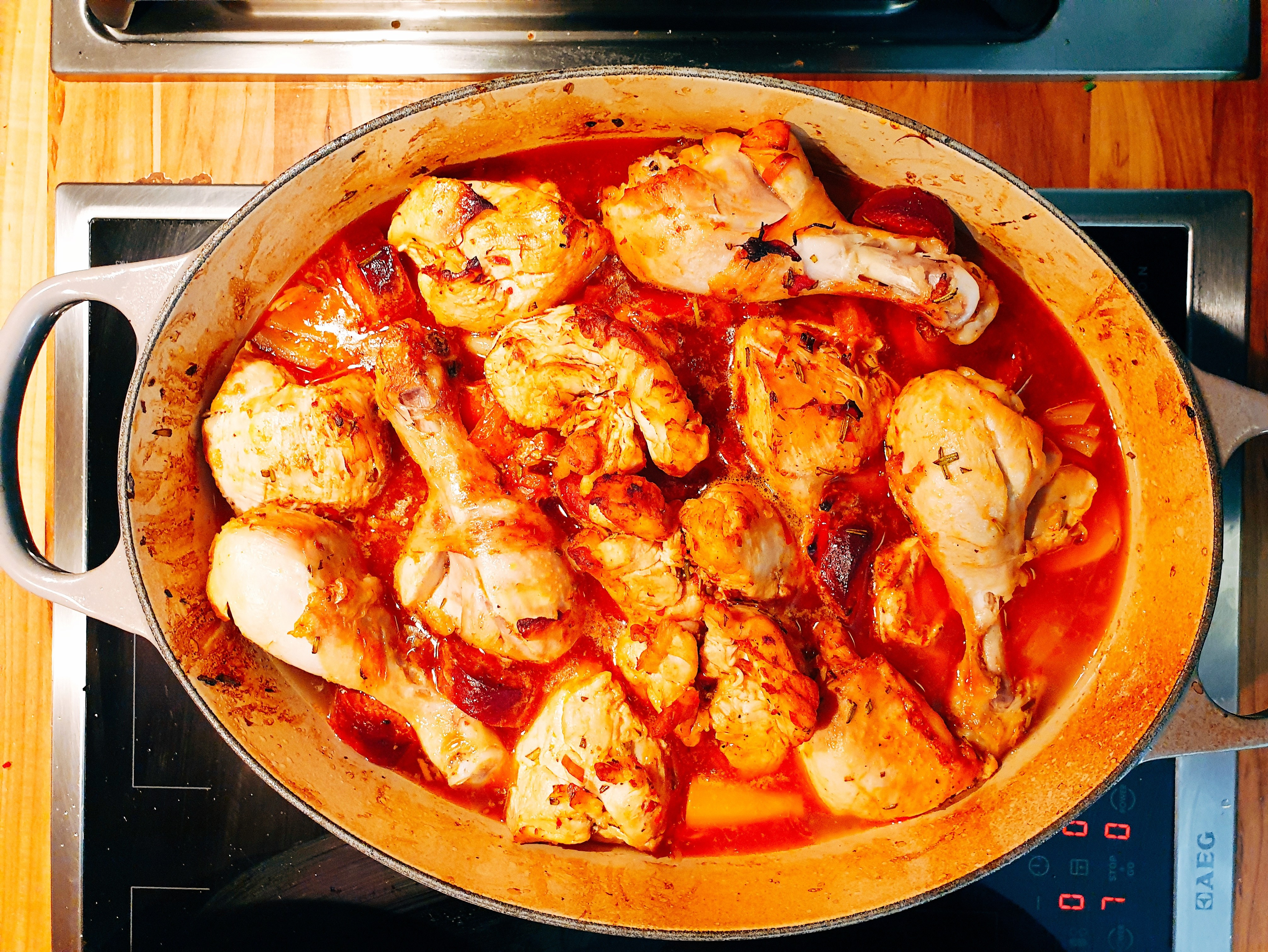 Das Fleisch mit der Paprika und der Chorizo auf das Gemüsebett legen und den Bräter ohne Deckel 45 Minuten in den Ofen schieben.