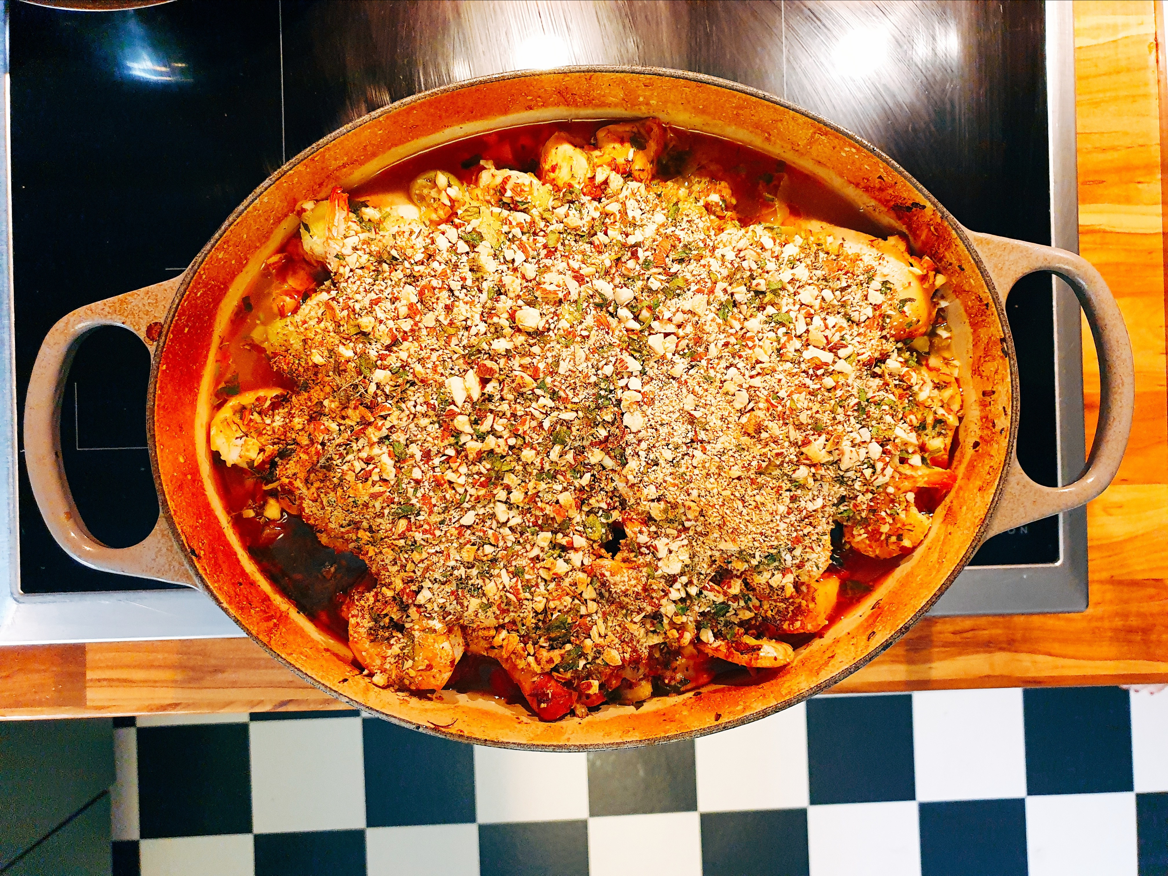 Den Eintopf nochmals auf die untere Schiene des Ofens schieben und weitere 10 Minuten garen, bis die Brösel knusprig sind.