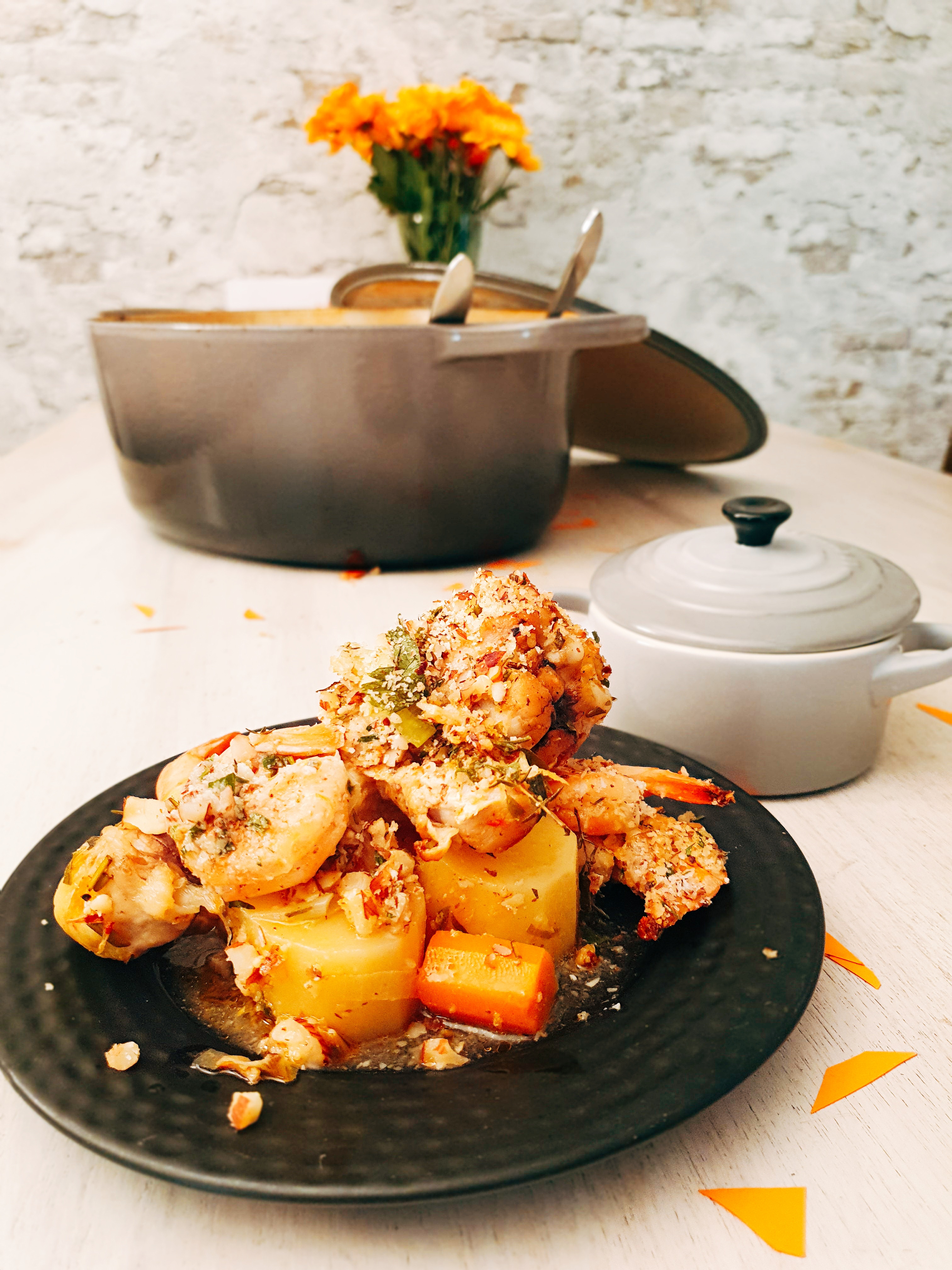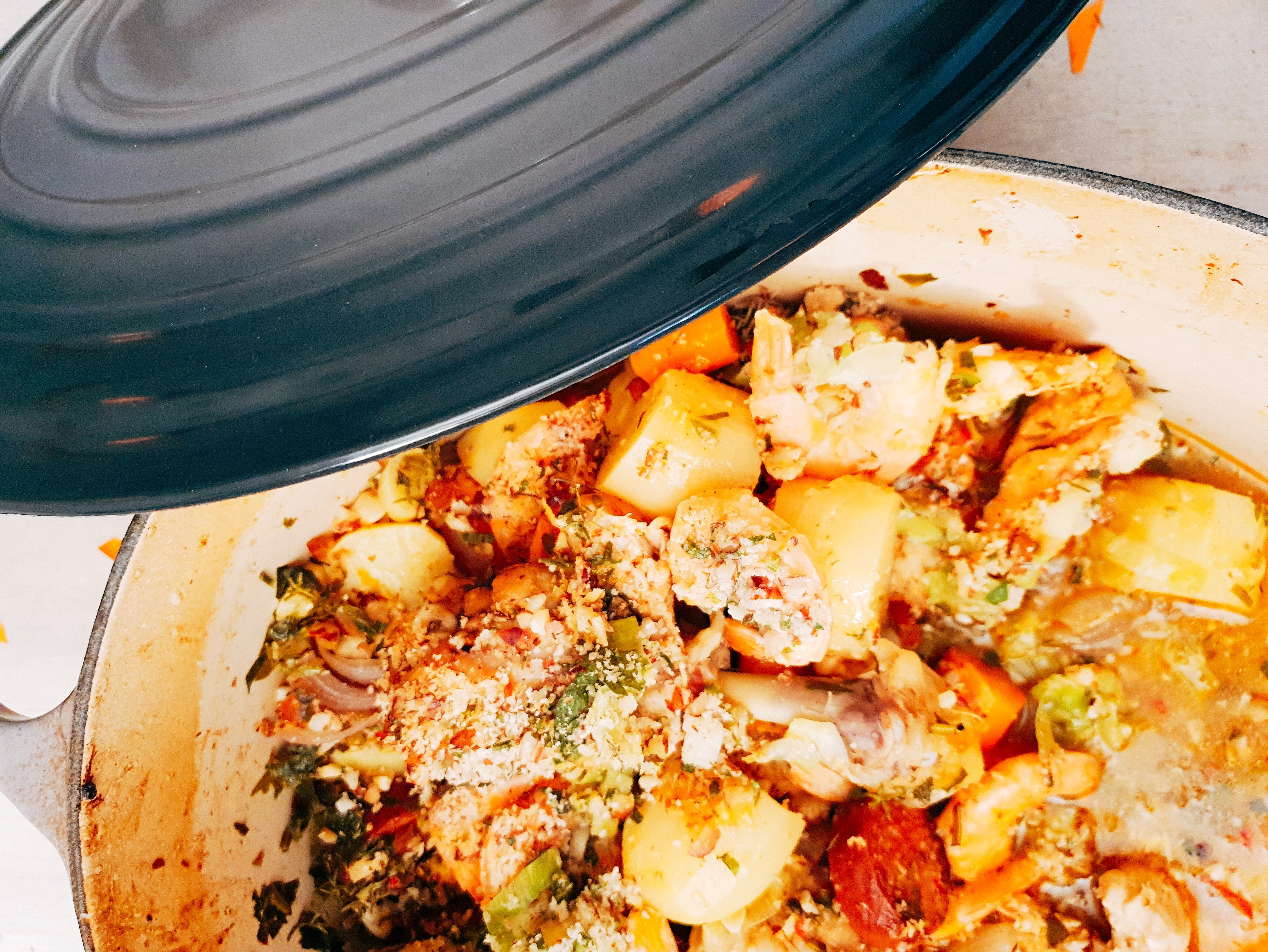 Es versteht sich von selbst, dass ich gleich am nächsten Morgen loslief, für ein würdiges Gericht einkaufte und den Le Crueset mit Küssen und Streicheleinheiten zu seinem ersten Job verhalf:
