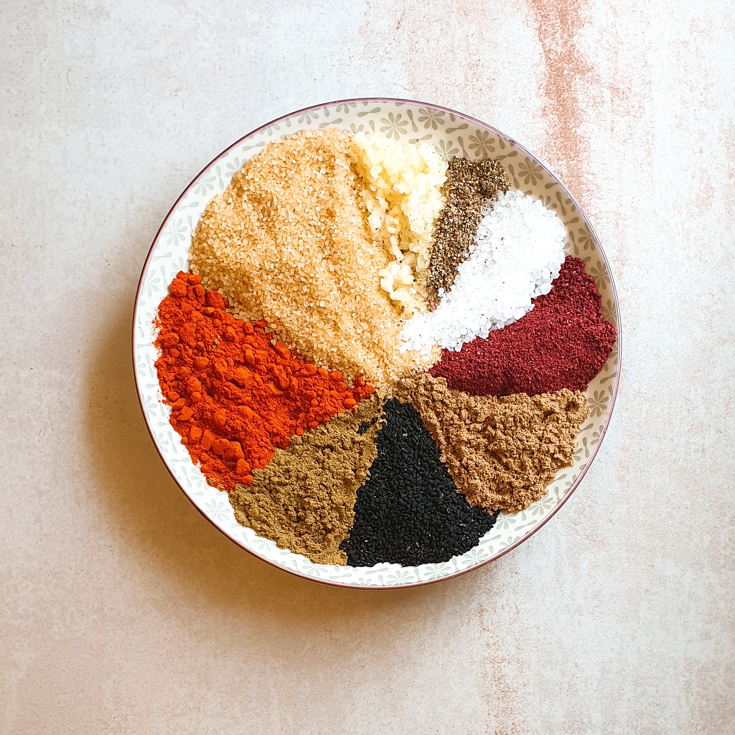 Die Gewürze (alle Esslöffel-Angaben meinen GEHÄUFTE Esslöffel!) und den Knoblauch in einer Schüssel mischen.