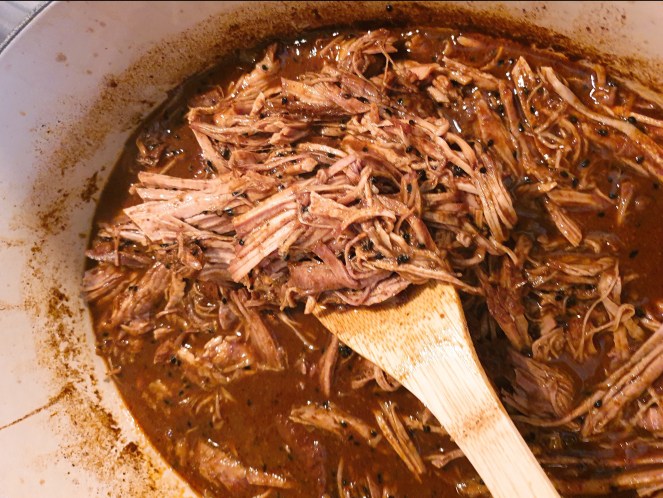 Nachdem die Stunde vergangen ist, wird die Marinade aus rotem Beerensmoothie, Whiskey und Cola in den Bräter gegeben. Das Ganze 6 bis 7 Stunden schmoren (nach 3 Stunden habe ich den Deckel aufgelegt). Am Besten legst du ein Thermometer neben den Bräter, um die Temperatur zu checken (nicht alle bleiben einwandfrei geeicht…) – der Ofen sollte bei knapp 100 °C gehalten werden, ohne dass die Sauce kocht. Hierbei alle 30 bis 60 Minuten das Fleisch drehen und/oder mit Sauce begießen.
