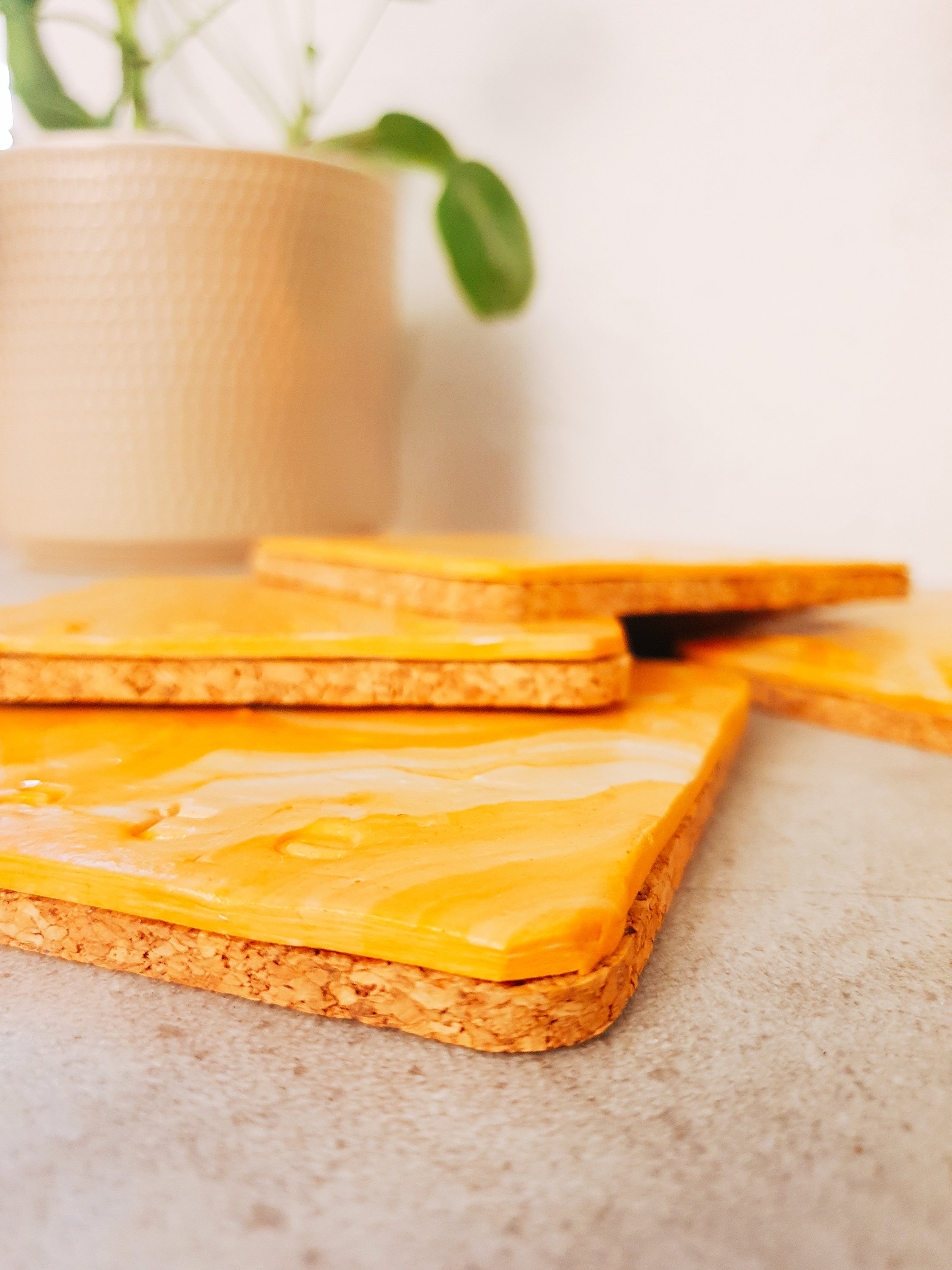 Mit einem glatten Buch oder Schneidebrett die Untersetzer nochmal von oben glatt drücken, damit die Oberfläche eben ist.