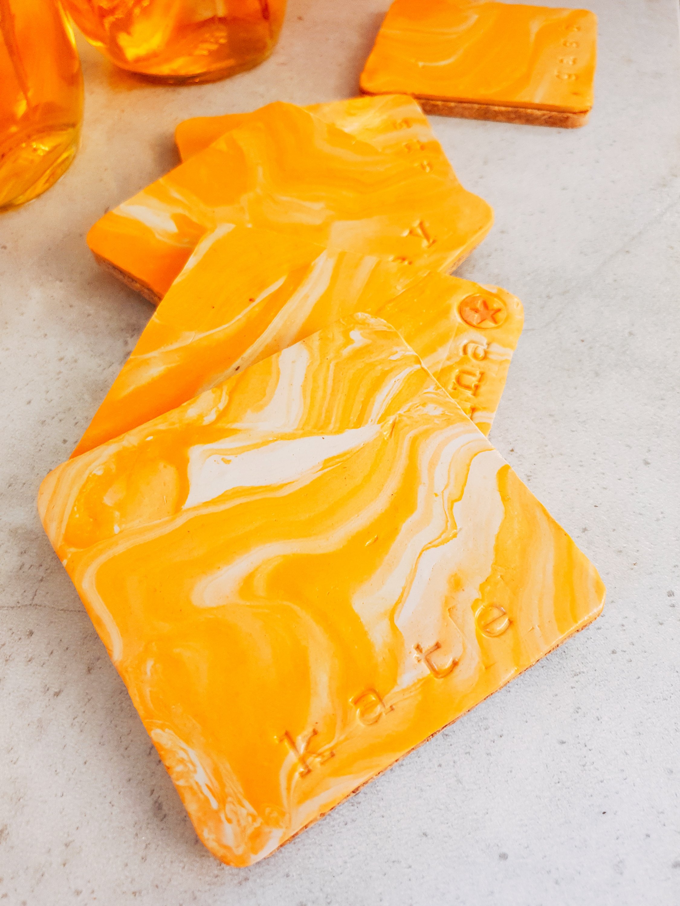 - 4 Blöcke Fimo (für Marmoroptik: die dunklere Farbe ist dominant, auch wenn ihr sie im Verhältnis weniger benutzt!) – ich habe mandarine und delfingrau benutzt //Affiliate Links