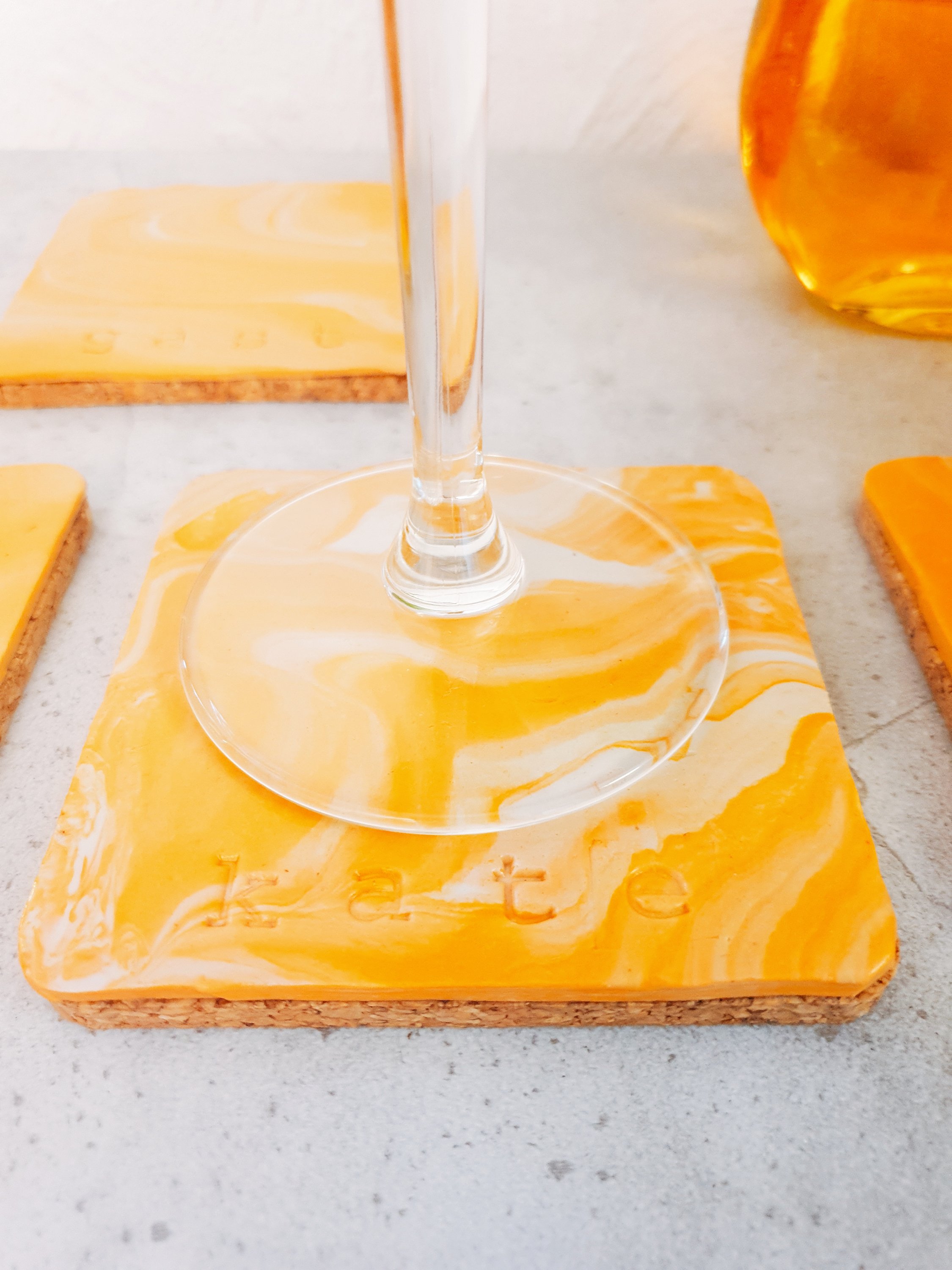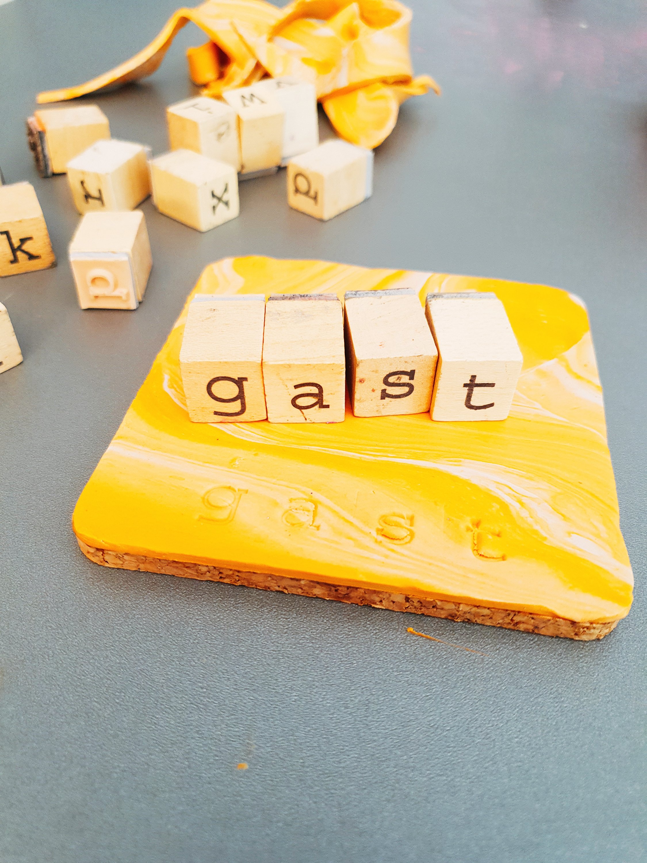 Die Untersetzer sind jetzt bereit für die individuelle Prägung. Für die Namen eurer Lieben kleine Buchstaben-Stempel vorsichtig in die Knetmasse drücken und wieder lösen.