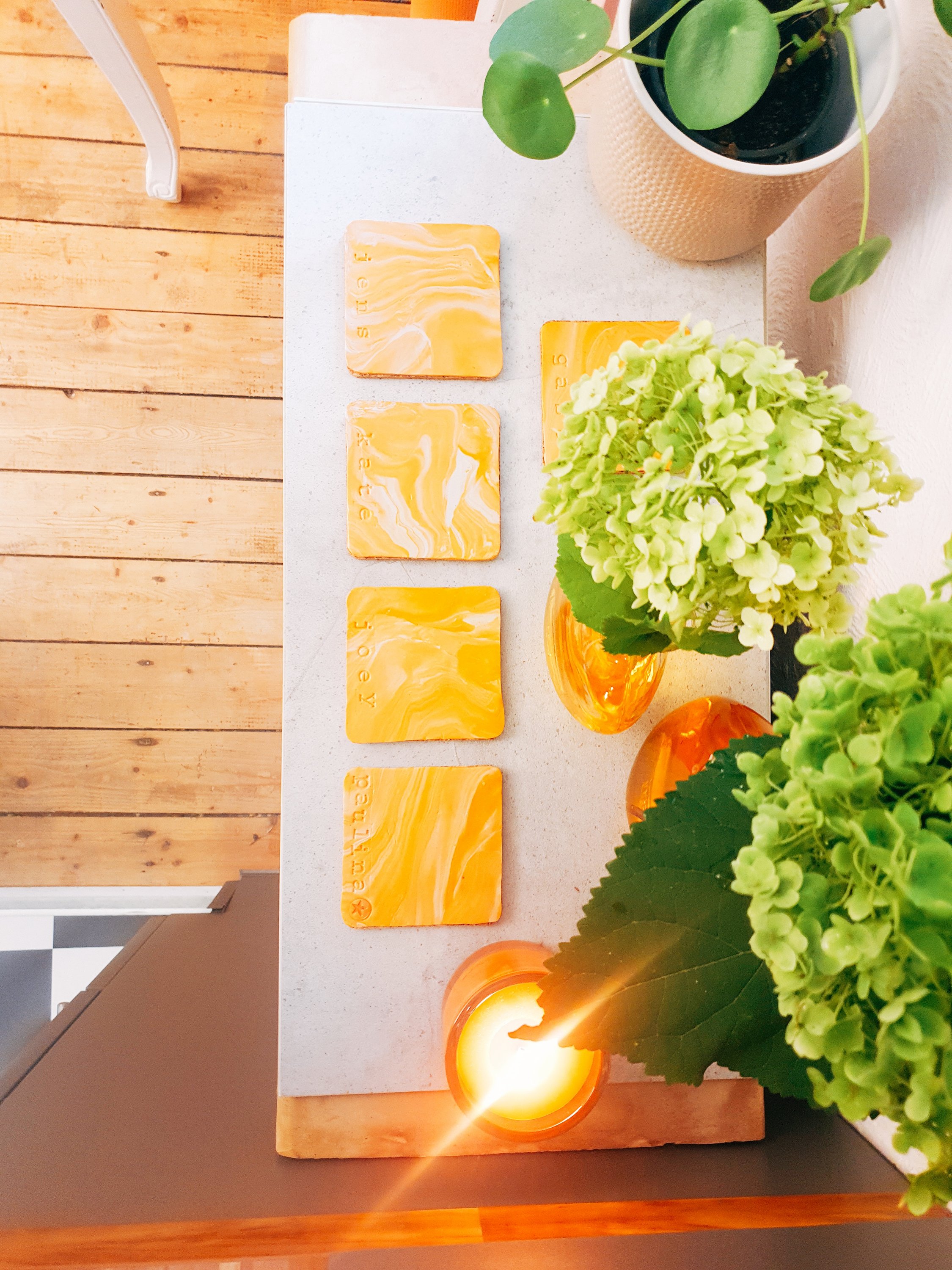 Die alten Untersetzer war ich jedoch leid, denn sie unterschieden sich nicht merklich und wir mussten uns die Position des eigenen merken. Meine Fimo-Idee lässt sich personalisieren und dazu mit allen denkbaren Farben herstellen, die zu eurem ausgewählten Untergrund und der Umgebung passen.