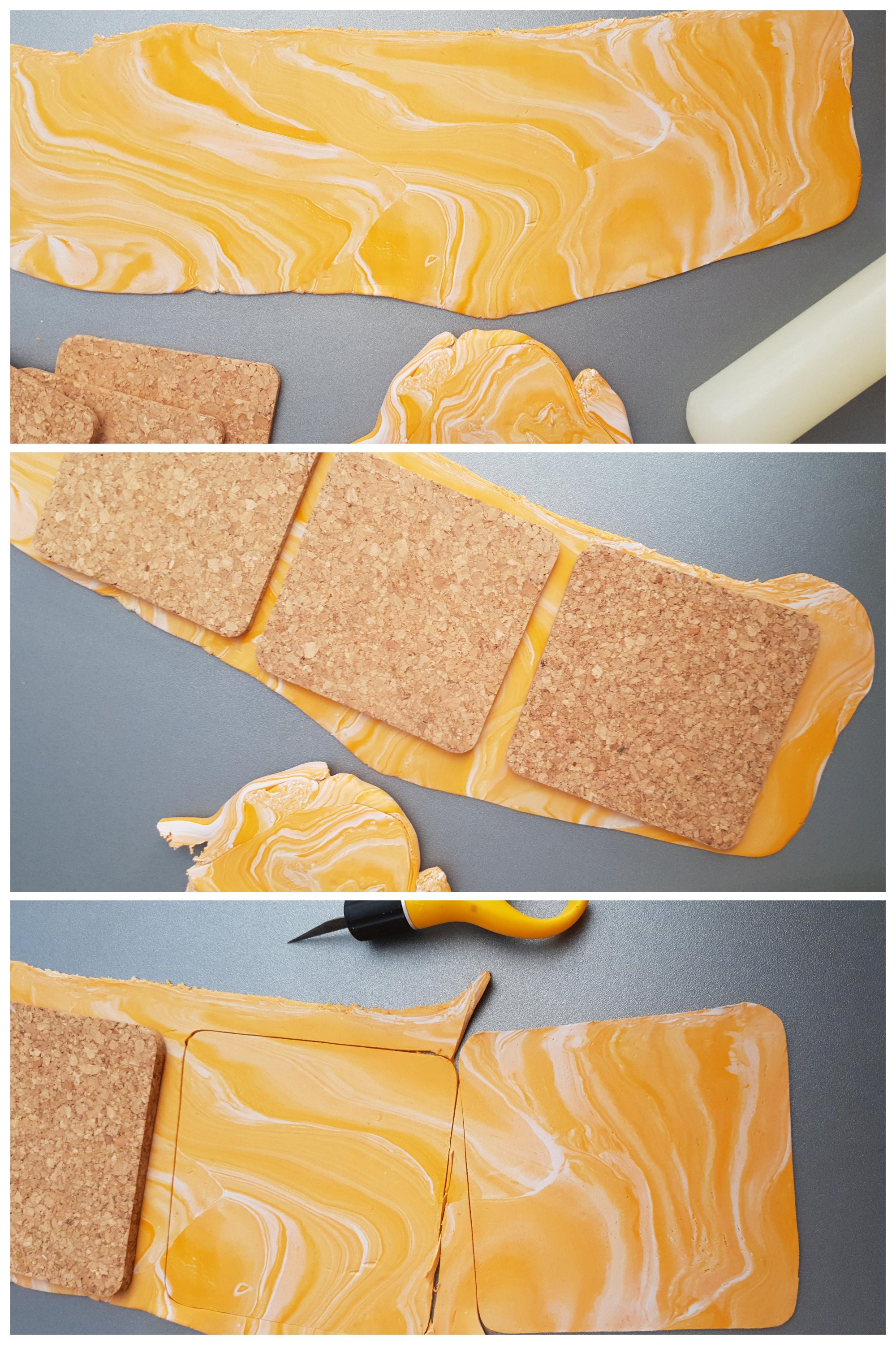 Jetzt ist nochmal Muskelkraft notwenig: das Fimo muss nun zu einer glatten Platte von etwa 5 mm Dicke ausgerollt werden, so wie ein Keksteig. Die Korkuntersetzer auf die Fimoplatte legen und das Fimo rundherum mit dem Messer abtrennen.