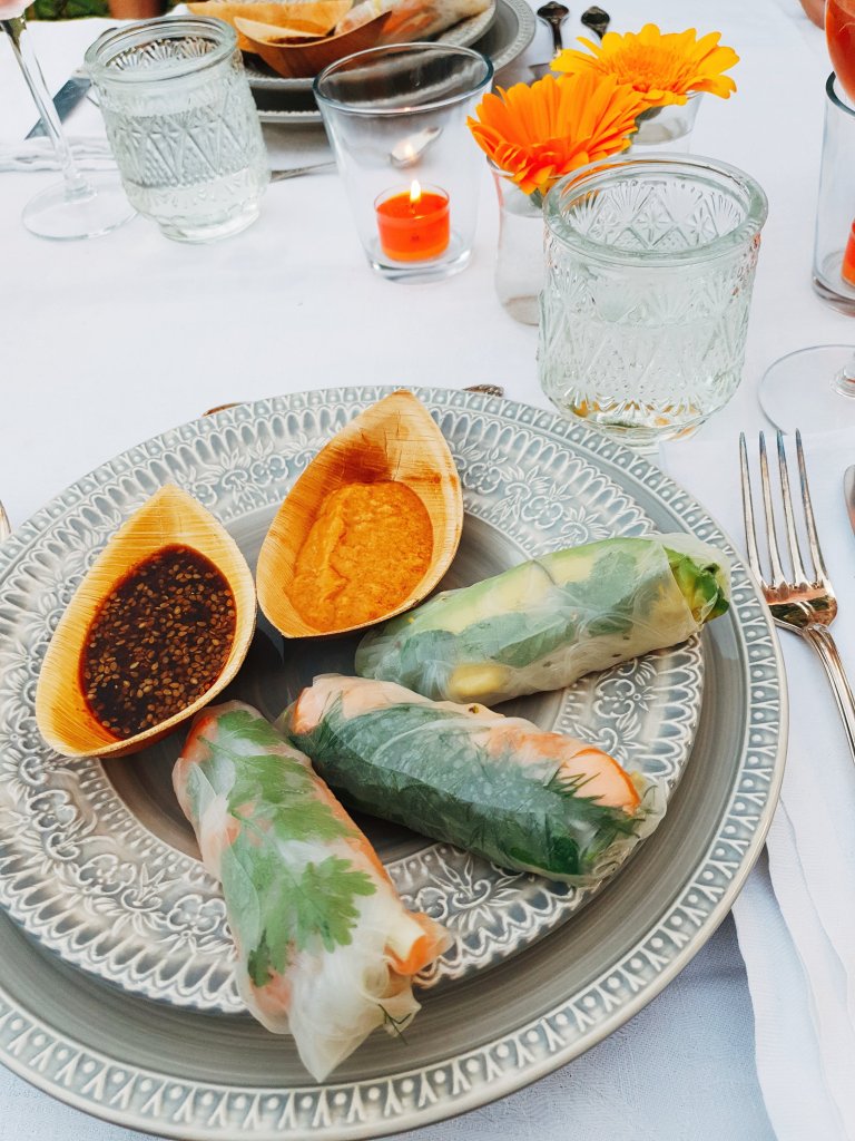 Da es bei meinem Ladies-Dinner an einem lauen Spätsommersamstag leider zu früh dunkel wurde und basteln bei Kerzenschein nicht ganz so gut kommt, habe ich die Rollen als Vorspeise serviert und lieber vorbereitet. Im Kühlschrank lassen sie sich prima lagern.