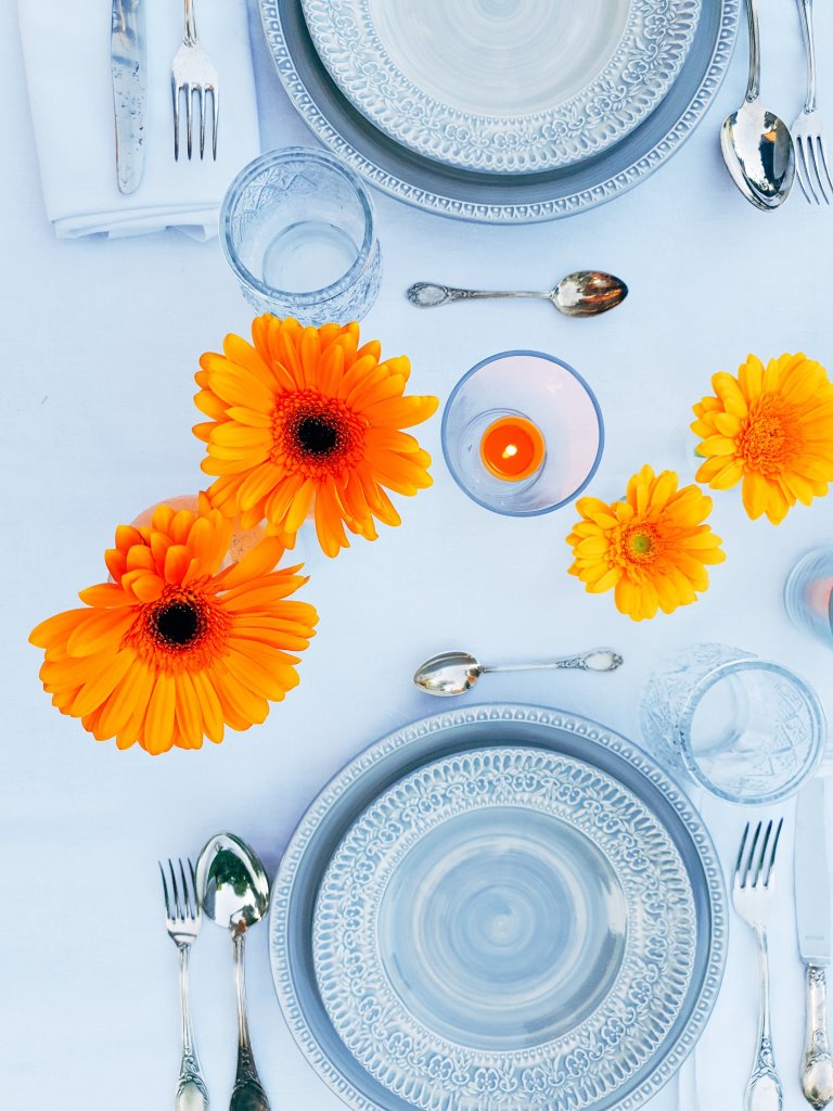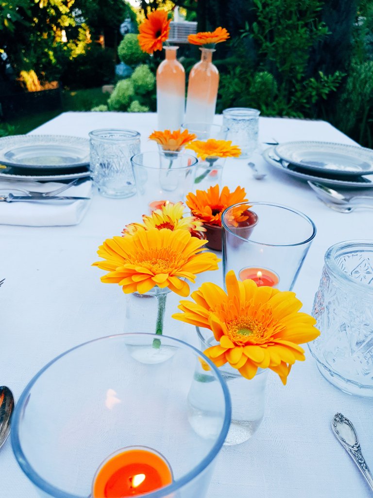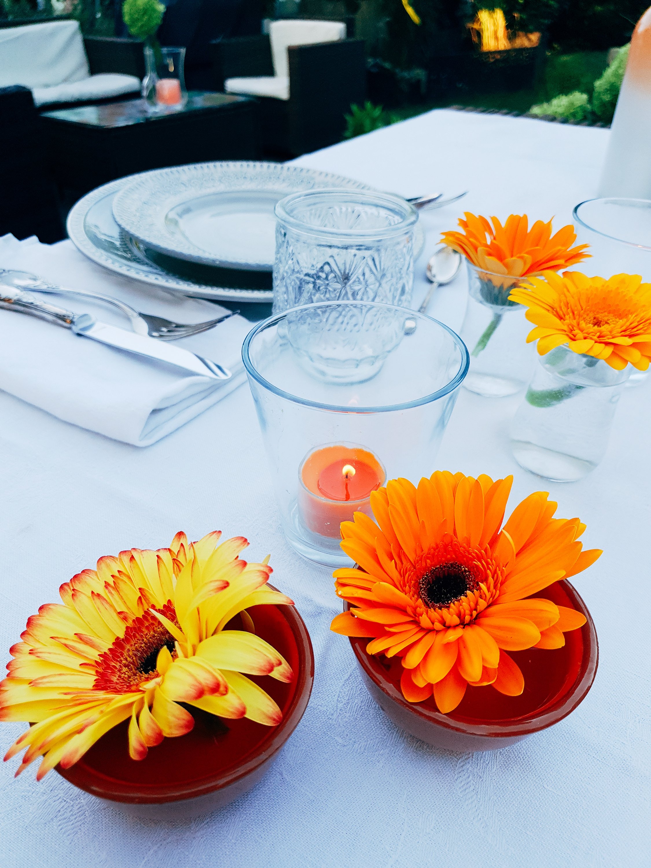 Ein Bund Gerbera schräg anschneiden, in unterschiedlich hohe Gläser, Schälchen und Vasen stecken und zusammen mit ein paar Kerzen auf dem Tisch verteilen. Das dauert keine 5 Minuten, ist kinderleicht und zaubert zusammen mit einer weißen Tischdecke und schönem Geschirr eine festliche Tafel.