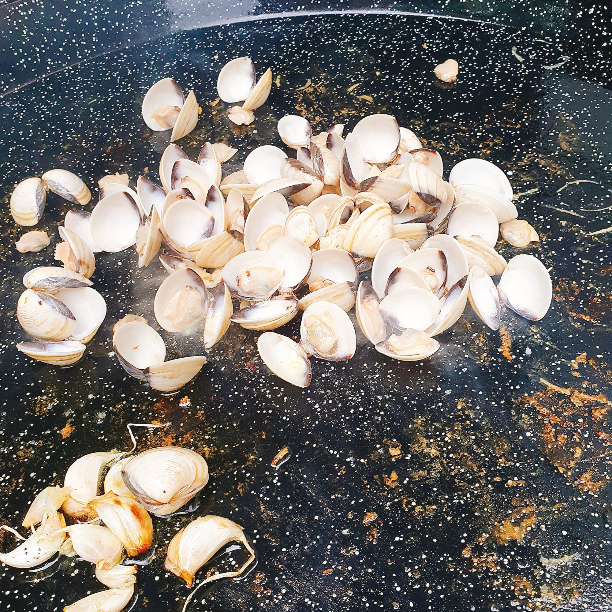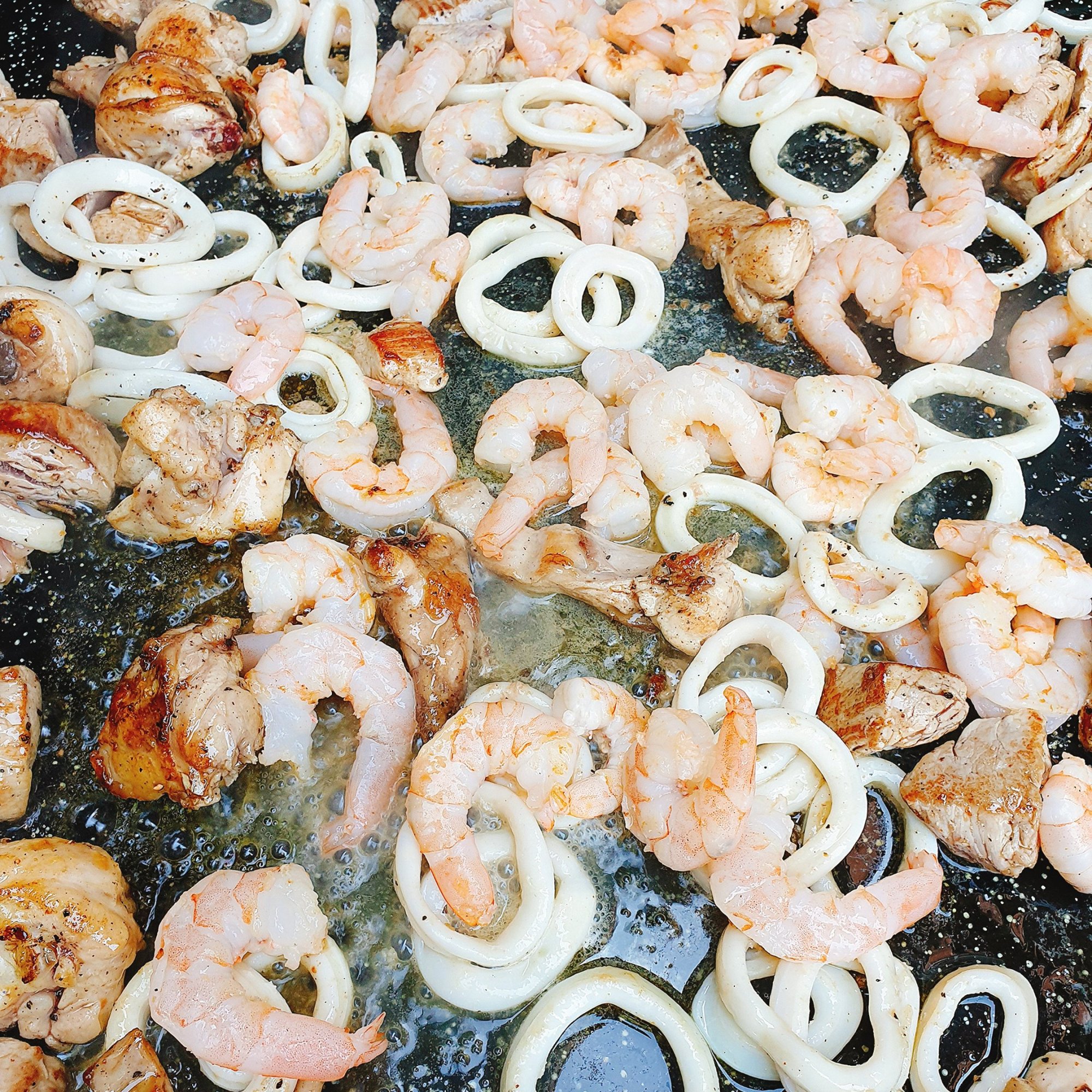 Tintenfisch, Garnelen, Venusmuscheln mit dem Knoblauch in der Schale , Kaninchen-/Hühnchenfleisch und Schweinefilet nacheinander in Olivenöl anbraten, das Fleisch salzen und pfeffern und schließlich alles außer den Muscheln zurück in die Pfanne geben. Den Knoblauch herausnehmen (den Knoblauch brauchst du jetzt nicht mehr – während die Paella gleich zieht, kannst du eine Aioli damit machen oder dieses Knoblauchöl!).