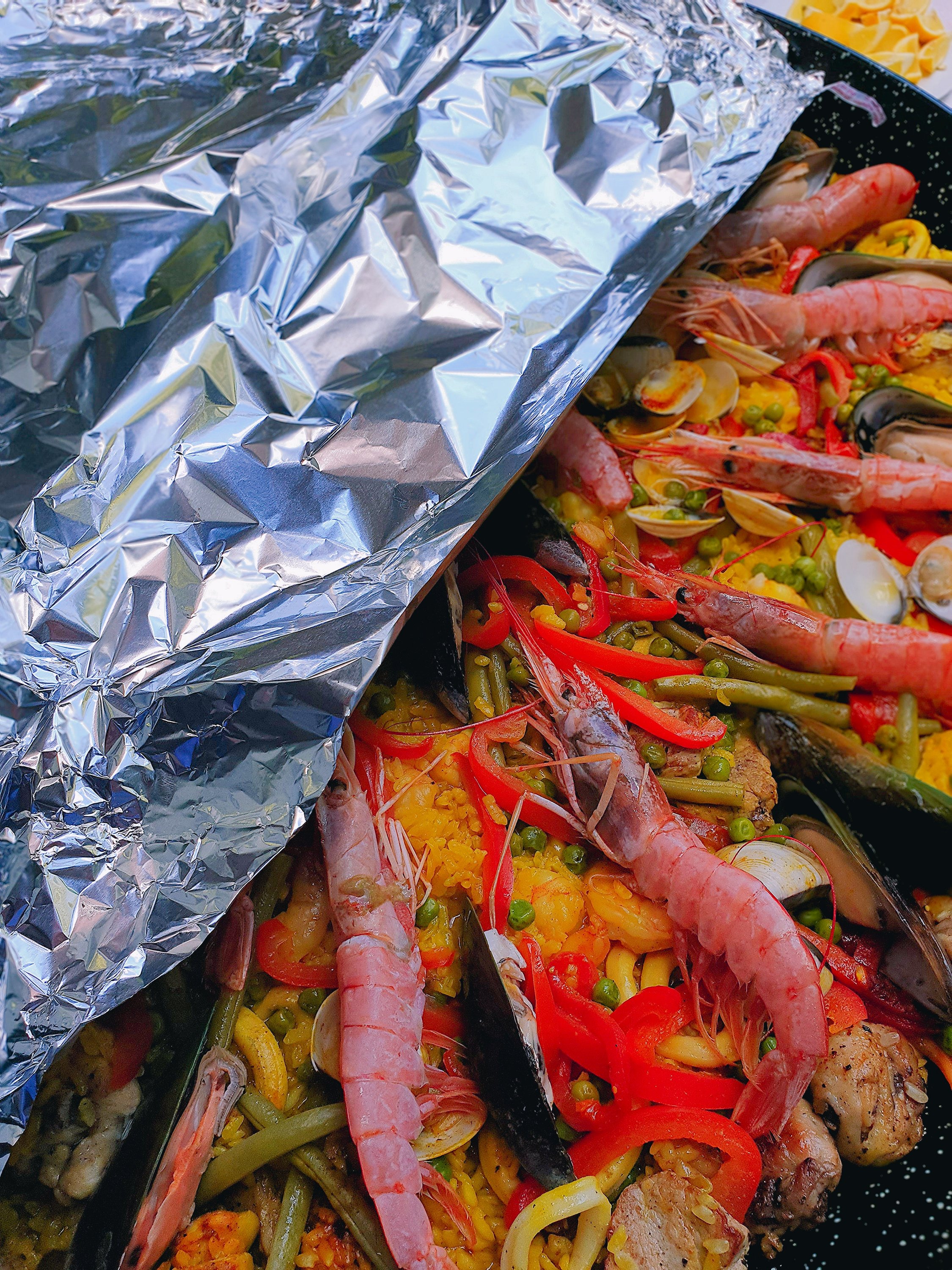 Die Riesengarnelen und die Miesmuscheln gleichmäßg verteilen. Nochmals mit der Alufolie bedecken und weiter leicht köcheln lassen. Immer mal wieder nachsehen, ob der Reis gargezogen ist.