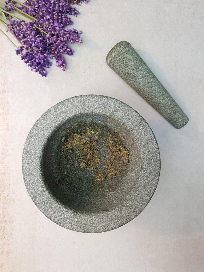 Die Blüten im Mörser zerreiben, zur Seife geben und untermischen.