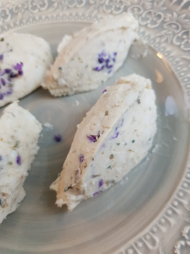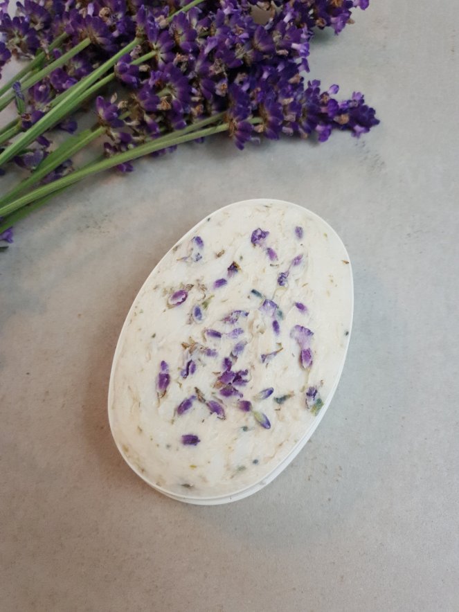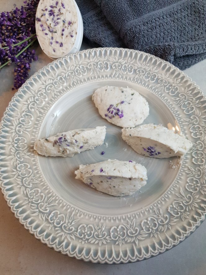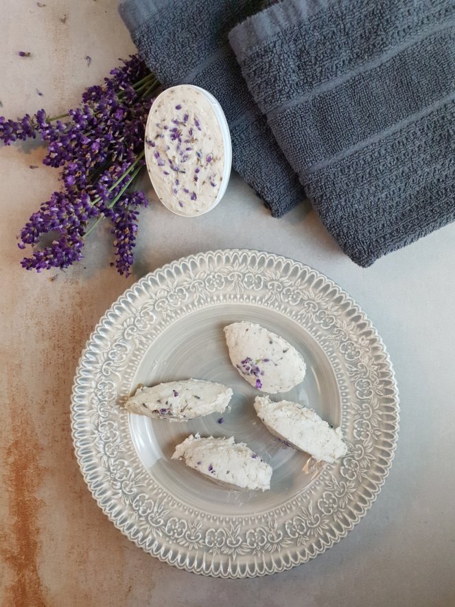 Die Seifenmasse in eine Form geben, mit ein paar (ungeriebenen) Lavendelblüten verschönern. 2 bis 3 Tage trocknen lassen.