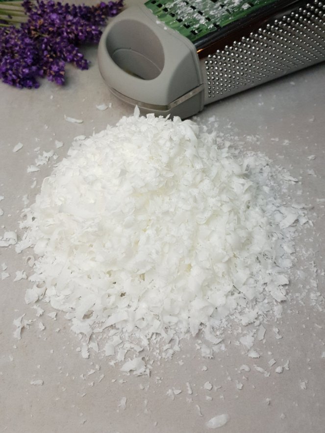 Die Kernseife mit einer Reibe raspeln in ein Gefäß füllen.