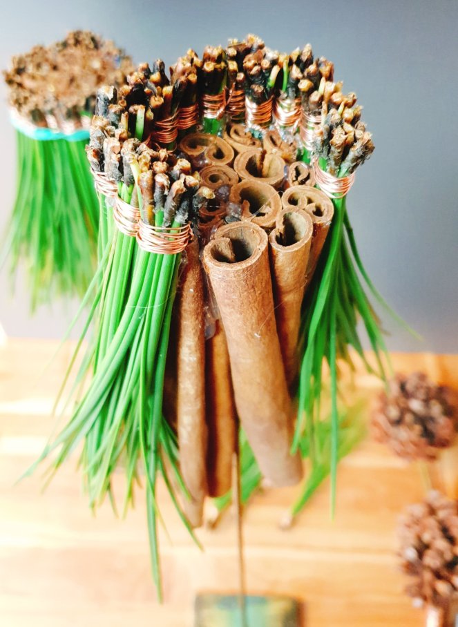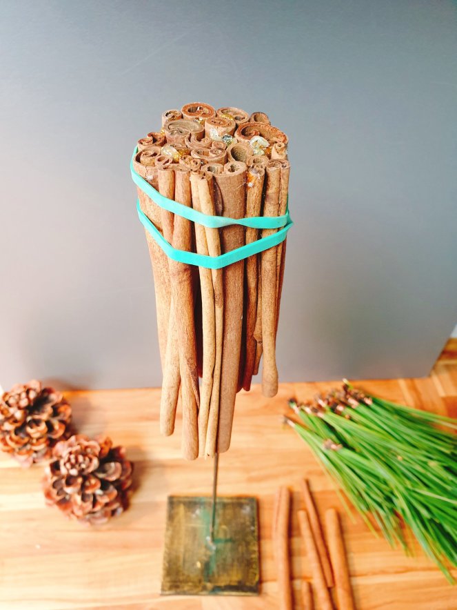 Wenn ihr dünne Ständer verwendet, so wie ich (sie waren halt im Keller #upcycling), schafft etwas Substanz für die Piniennadeln, indem ihr Zimtstangen mit Heißkleber um den Ständer klebt. Mit Haushaltsgummis fixiert ist der Kleber in wenigen Minuten abgekühlt und bombenfest.
