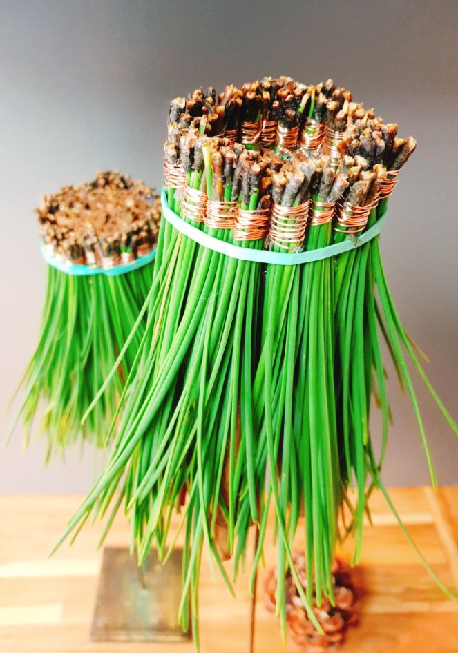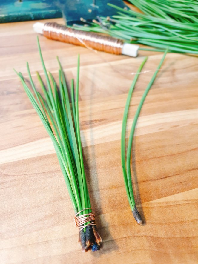 Im nächstem Schritt legt ihr etwa 8 Piniennadeln-Zwillinge in der Hand ordentlich an den Köpfen zusammen und umwickelt sie unterhalb der Köpfe stramm etwas 10 mal mit Draht, die Enden dann zusammenzwirbeln und mit einer Drahtschere abschneiden.